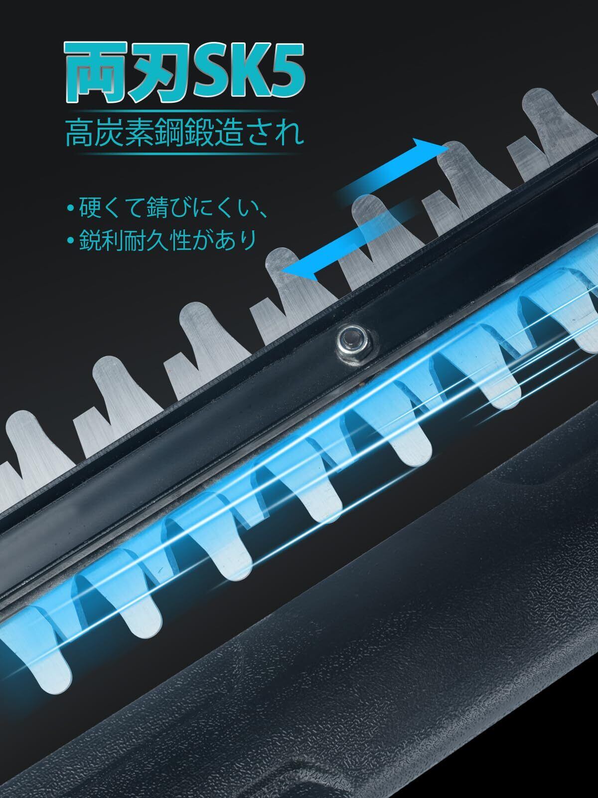軽量かつバランスの良い設計: 長い時間操作する快適さを考慮して、当社の生垣刈り込みは人間工学に配慮した設計を採用しています。扱いやすい軽量設計とバランスの良いグリップが、長時間の作業でも疲れにくく、快適な操作を提供します。女性や初心者でも簡単に植物の刈り込みができます。保護具とカッティングガード付きなので、緩んだ枝で手を傷つける心配がありません。