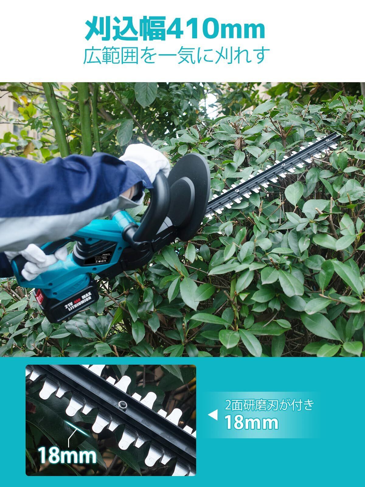 両刃駆動・効率的な切断性能:POXITY ヘッジトリマーの最大切断径は18mm、刈込幅410mmの両刃駆動の設計で、広い切断範囲と強力な切断能力が提供され、1回の操作で広い範囲の樹塀を迅速かつ正確にトリミングすることができます。5平方フィート/秒に達し、園芸の保守効率を大幅に向上させ、刃が勢いよく入っていく感じられます。