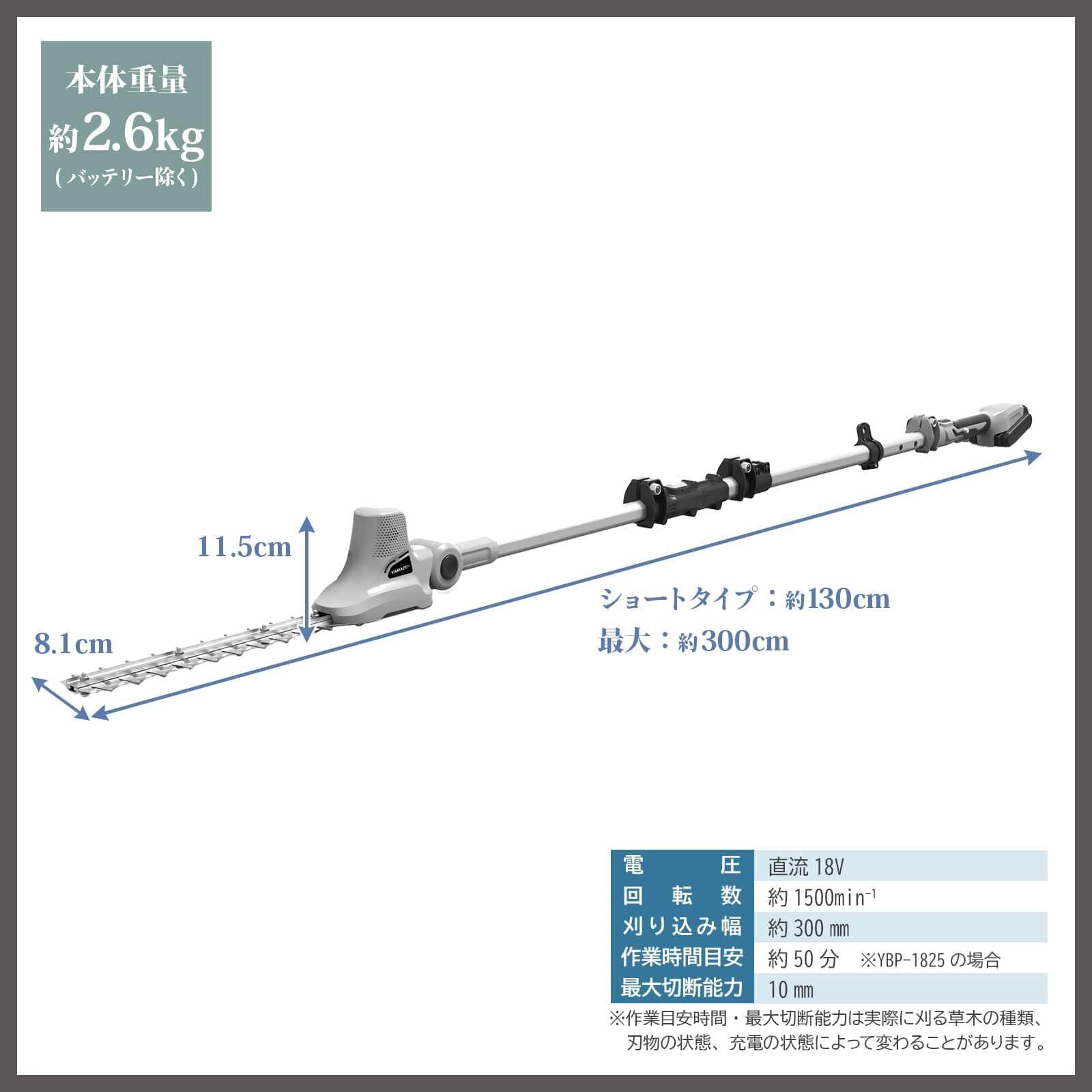 【仕様】サイズ:最大=約W3000×D81×H115mm、ショートタイプ全長約W1300mm/重量:約2.6kg(ブレードカバー・肩掛けバンド・バッテリーを除く)/電圧:直流18V/作業時間目安:約50分(※別売のバッテリーYBP-1825の場合)/刈込幅:約300mm/最大切断能力:約10mm/回転数:1,500min-1/内容:ポールヘッジトリマー本体+着脱式伸縮延長ポール、ブレードカバー、保護メガネ、肩掛けバンド、取扱説明書 ※バッテリー充電器は別売