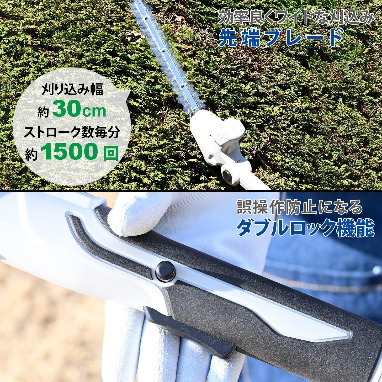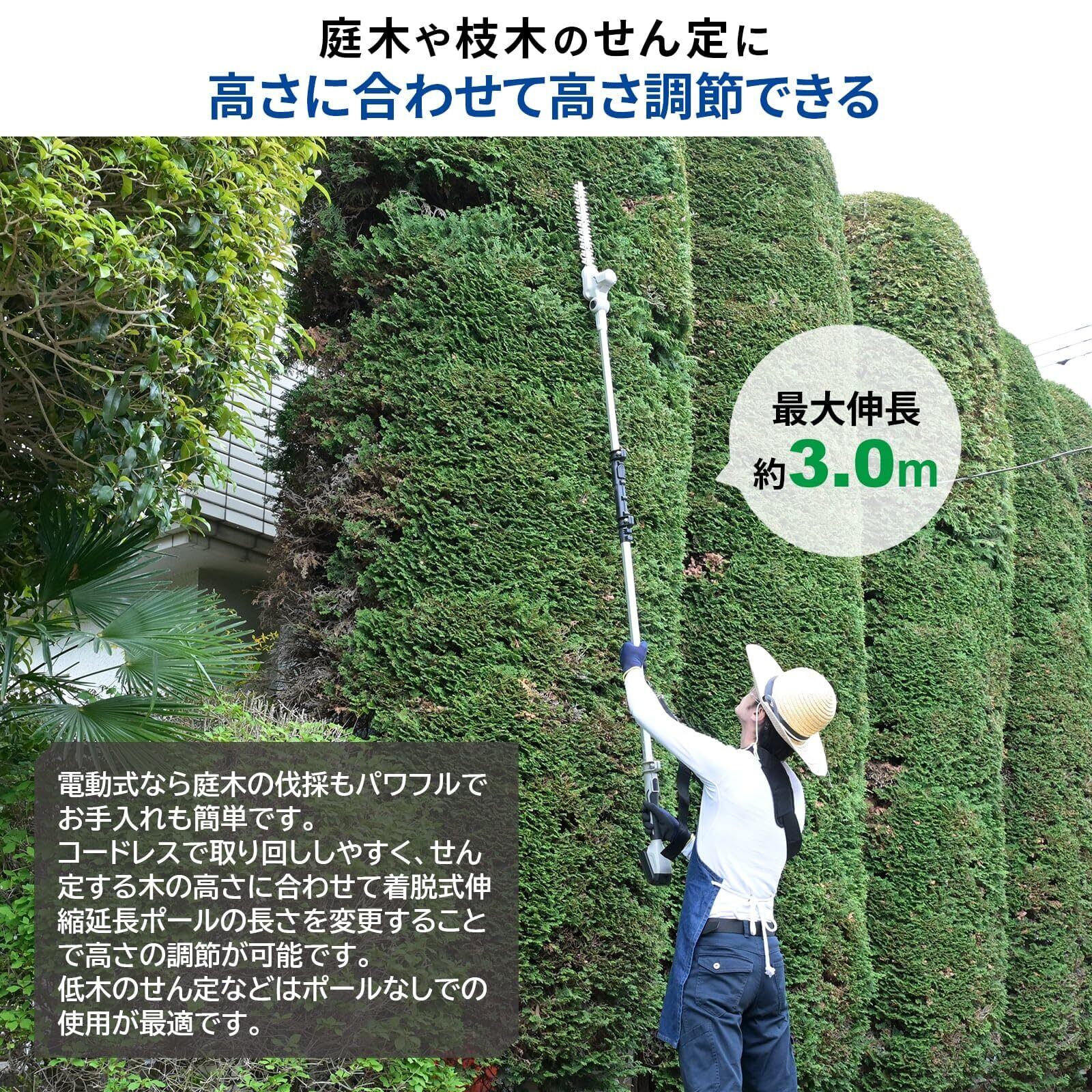 【特徴】手の届きにくい高い位置の生垣や極めて幅の広い生垣の作業に使えるヘッジトリマー(充電式)です。充電式なので電源のない場所にも便利です。伸縮ポールで最大約3mの長さになるので、高い場所もラクラク剪定できます。ヘッドの角度は約180度可動調整が可能で便利です。バッテリー(別売)は1.5Ahタイプと2.5Ahタイプの2種類から使用用途に合わせて選べます。