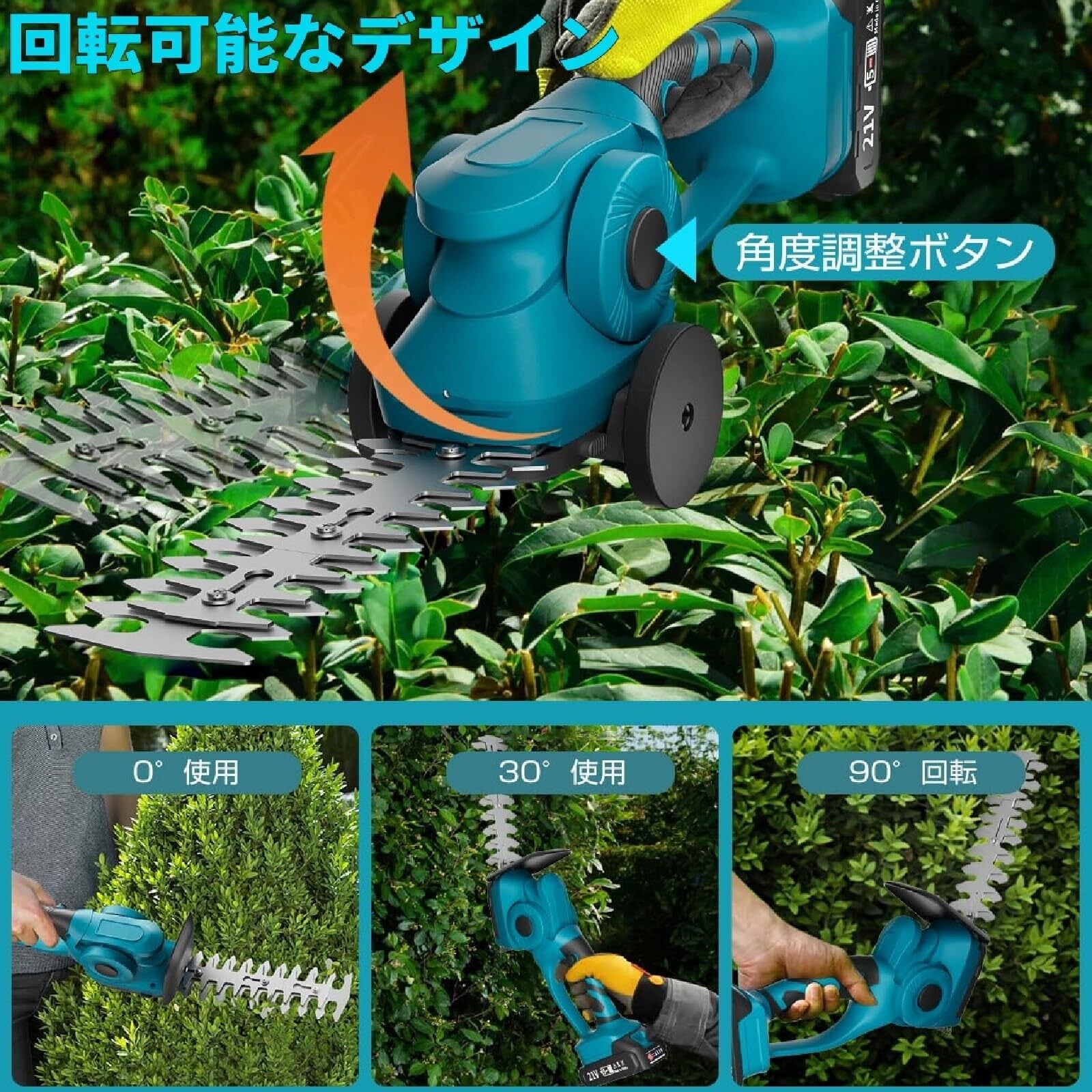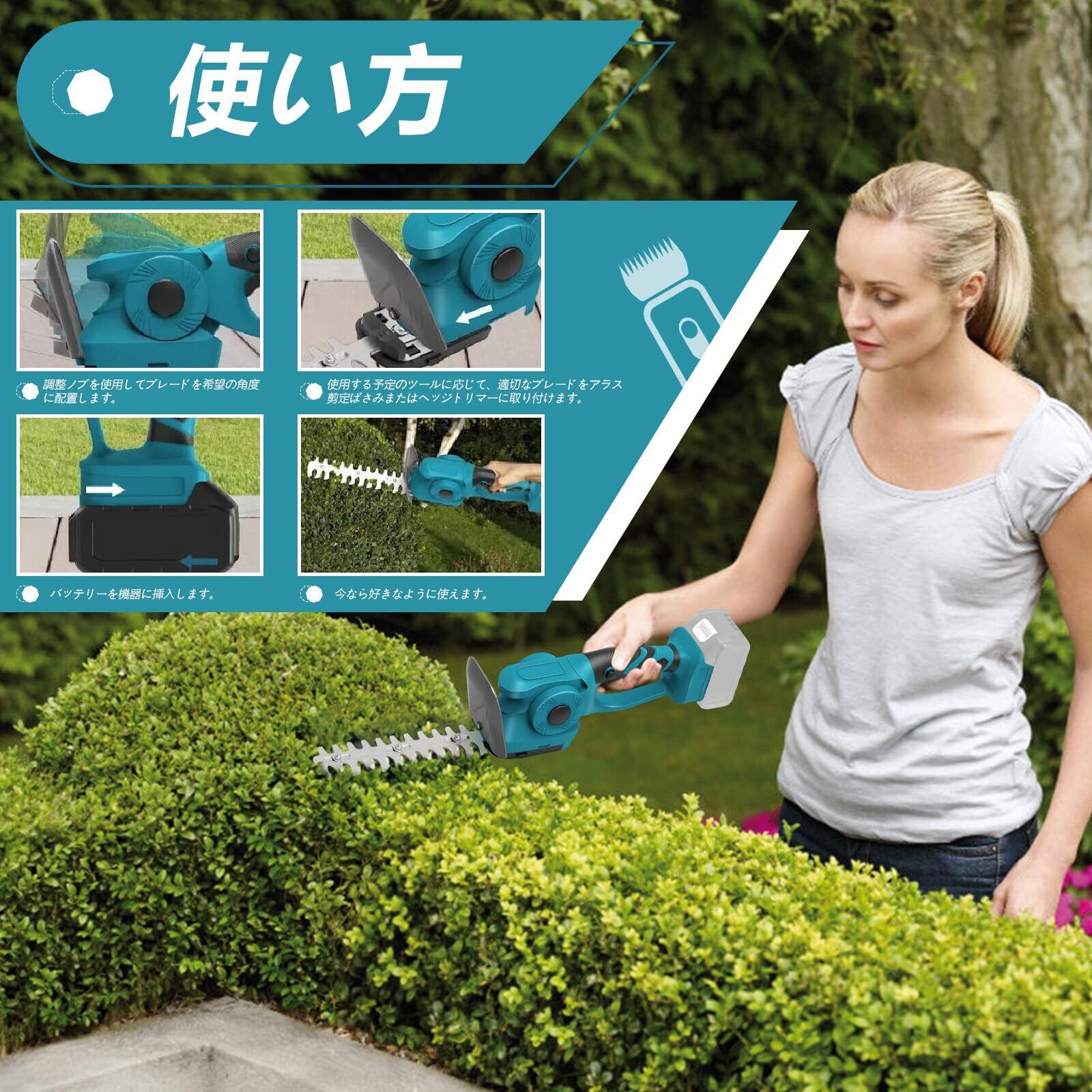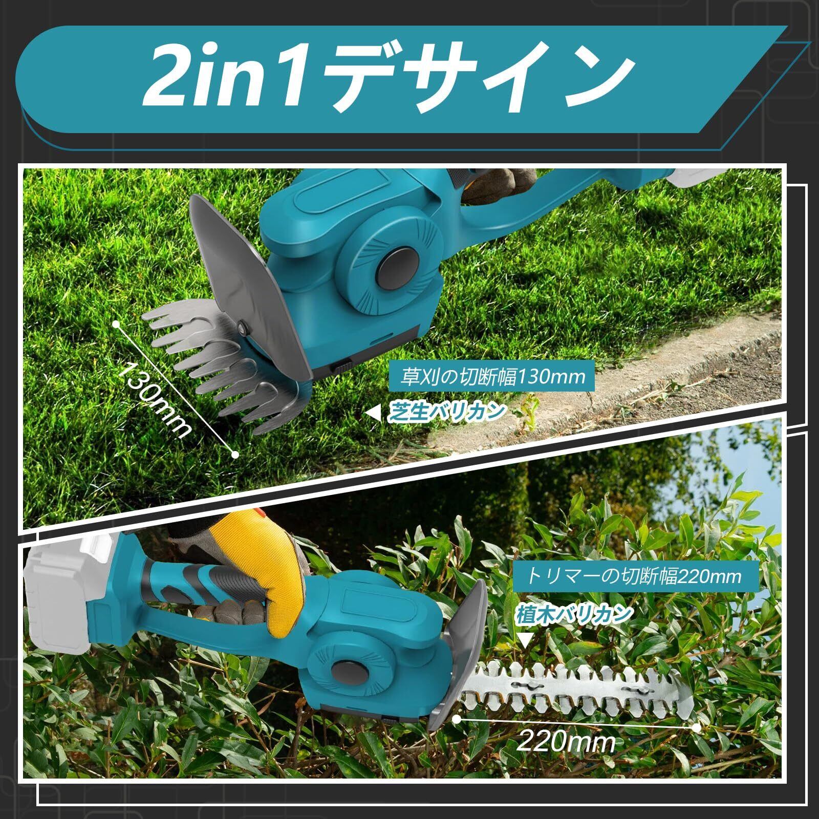 芝生バリカン 2-IN-1 ヘッジトリマー【マキタ互換】両刃駆動 400W マキタ 18Vバッテリー対応 5段階切断角度調整 刈込幅200mm/130mm 軽量 低騒音設計 庭木剪定/生垣刈込/芝刈り対応 手袋とドライバーが付属 【本体のみ バッテリー別売り】