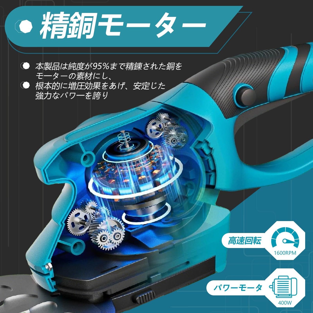 【95%高純度銅モーター】航空機にも使用される高純度銅モーターを採用。毎分1,500回転の高速切削で、最大8mmまでの枝もスムーズに切断。従来比30%アップのトルクを実現し、密集した生垣もストレスなく仕上げられます。