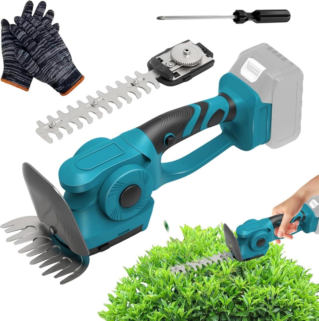 【数量限定】芝生バリカン 2-IN-1 ヘッジトリマー【マキタ互換】両刃駆動 400W マキタ 18Vバッテリー対応 5段階切断角度調整 刈込幅200mm/130mm 軽量 低騒音設計 庭木剪定/生垣刈込/芝刈り対応 手袋とドライバーが付属 【本体のみ バッテリー別売り】