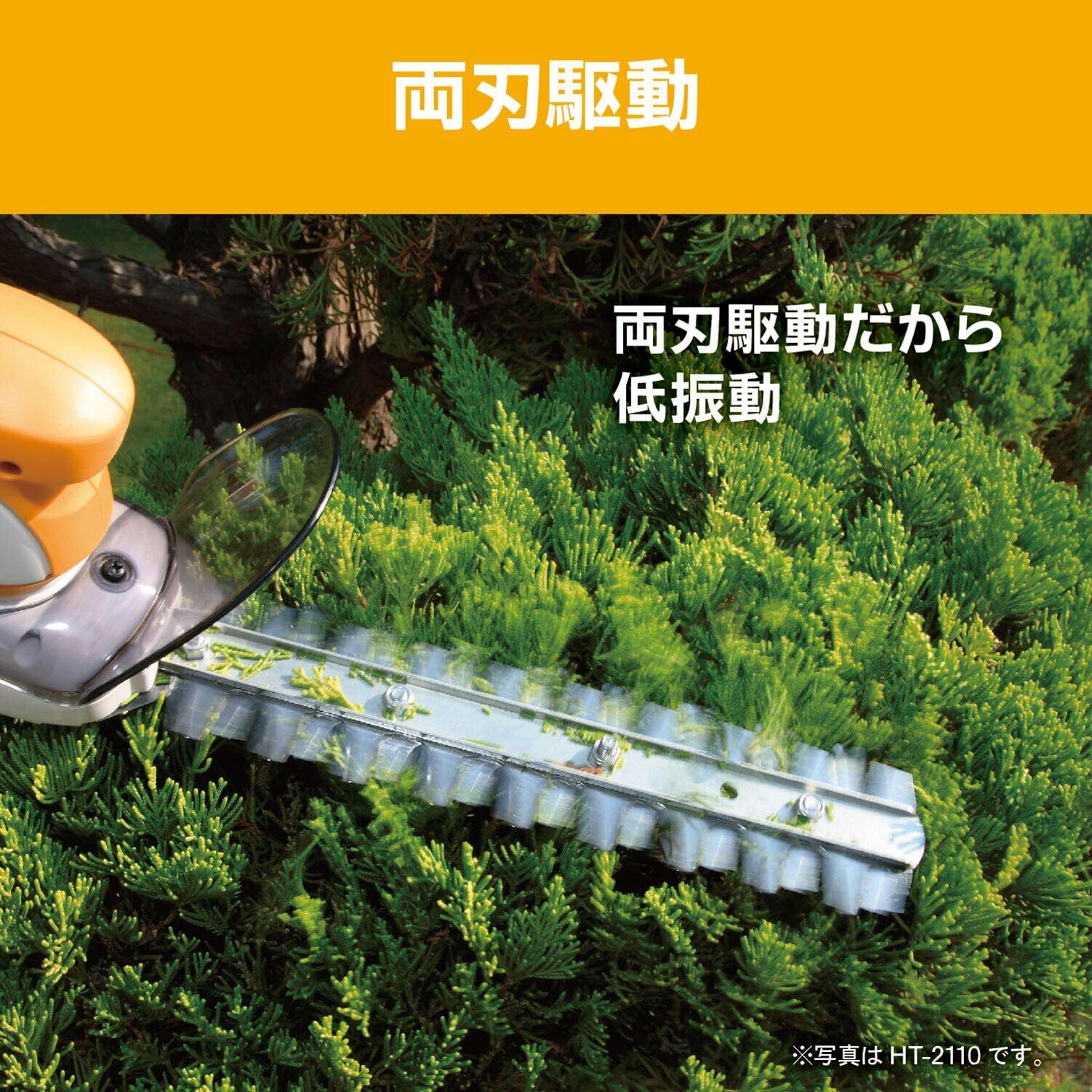 《仕様》 刈刃駆動方式:両刃駆動 刈込幅:260mm ストローク数:1,500min-1 ストローク量:18mm 最大切断枝径※:10mm ※樹木の種類や刃物の切れ味などにより変わる場合があります。 電源:単相100V 電流:0.9A 消費電力:80W 質量:0.89kg