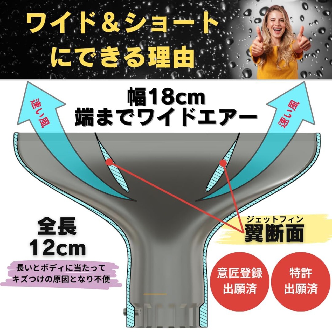 【️ノズル両端まで強い風】内部の2ヶ所に翼断面形状ジェットフィンを設置したオリジナル設計。フィンの翼表面の辺の長い方の風の流れが速くなることにより、風が両端まで均一に広がって強い風を保つようになりました。(意匠登録済、中)