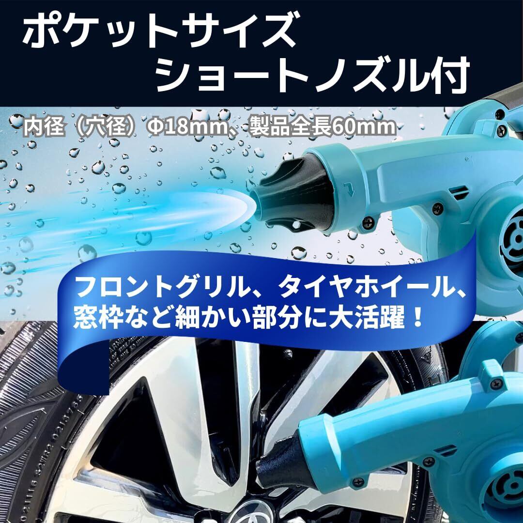 【️ショートノズル付き:内径(穴径)Φ18mm、製品全長60mm】ポケットサイズで取り回し快適なショートノズル付き。ブロワ付属の標準ノズルの代わりにご使用できます。スキマや細かい場所を狙い撃ち!フロントグリル、タイヤホイール、窓枠などの水滴を吹き飛ばします。