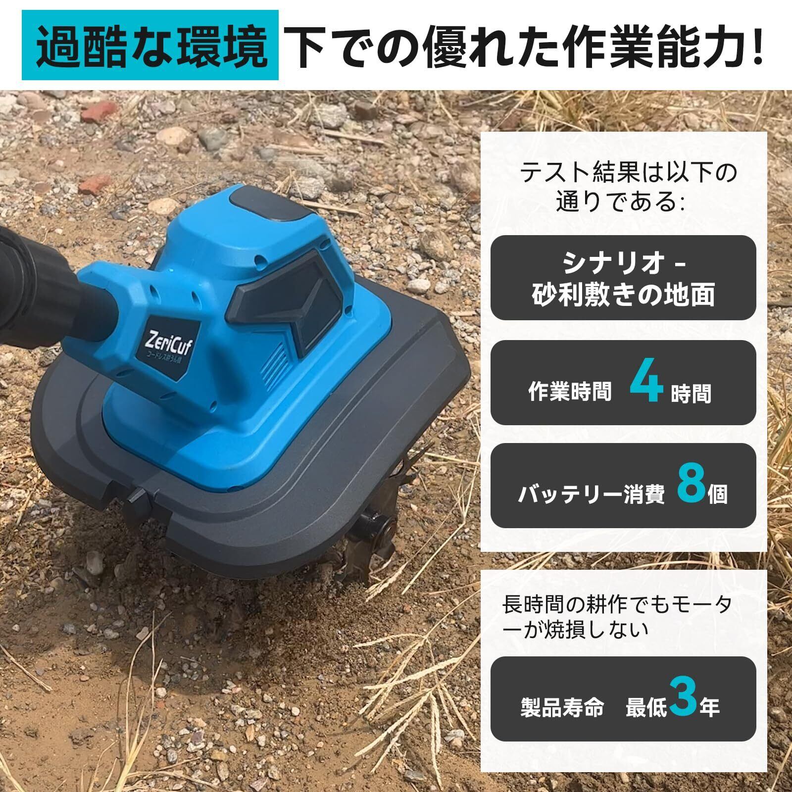 ️【モーター3面冷却|超長時間駆動|3年】業界初となる家庭用充電式耕運機のモーター3面冷却孔設計を採用。Zericuf電動耕うん機の耕運効率をさらに高めます(高温によるモーター出力低下がありません)。最大連続稼働時間は4時間に達し、4.0Ahリチウムイオンバッテリー8個を一度に消費可能です。さらに、当社製品には3年間の品質が付いています。