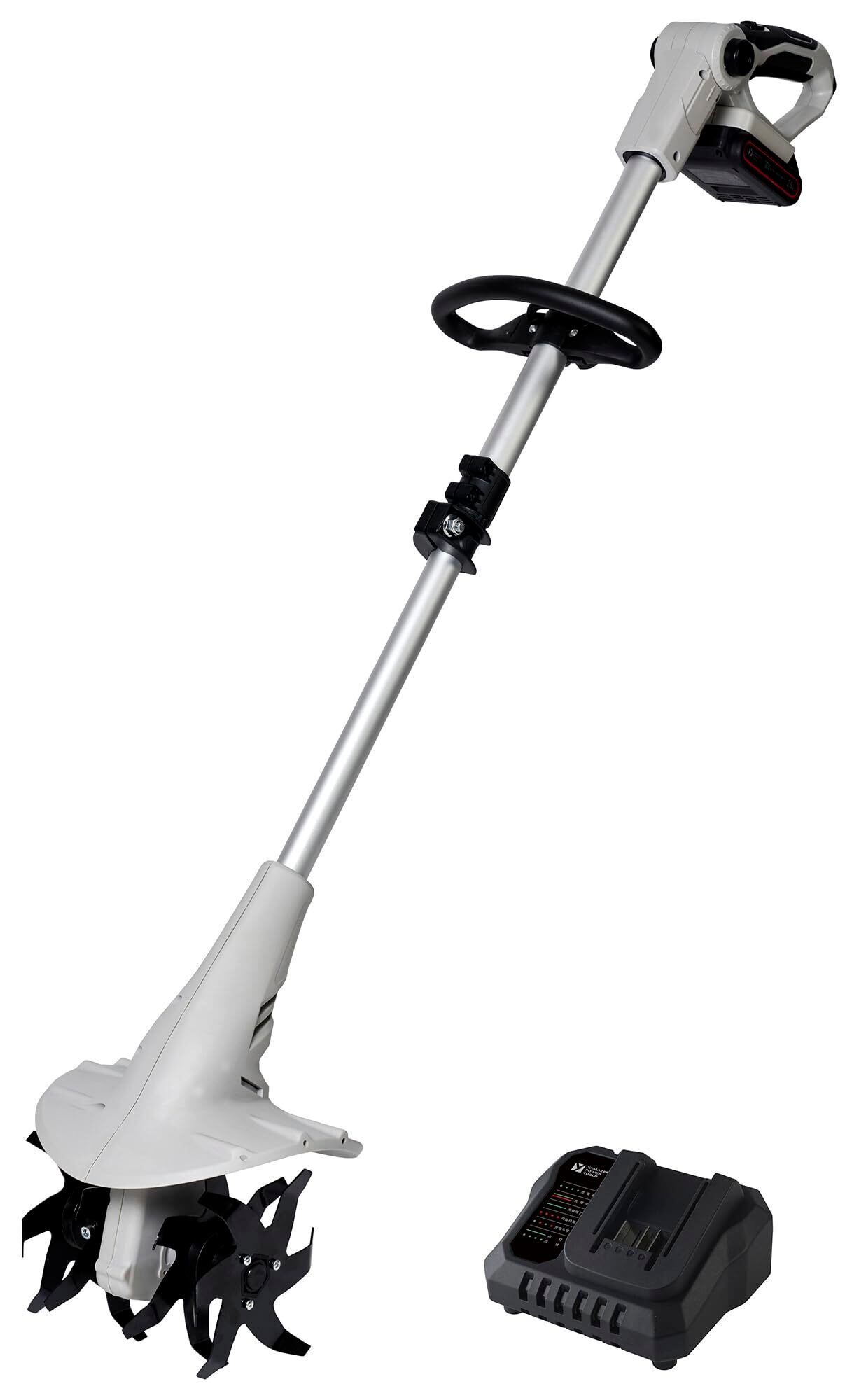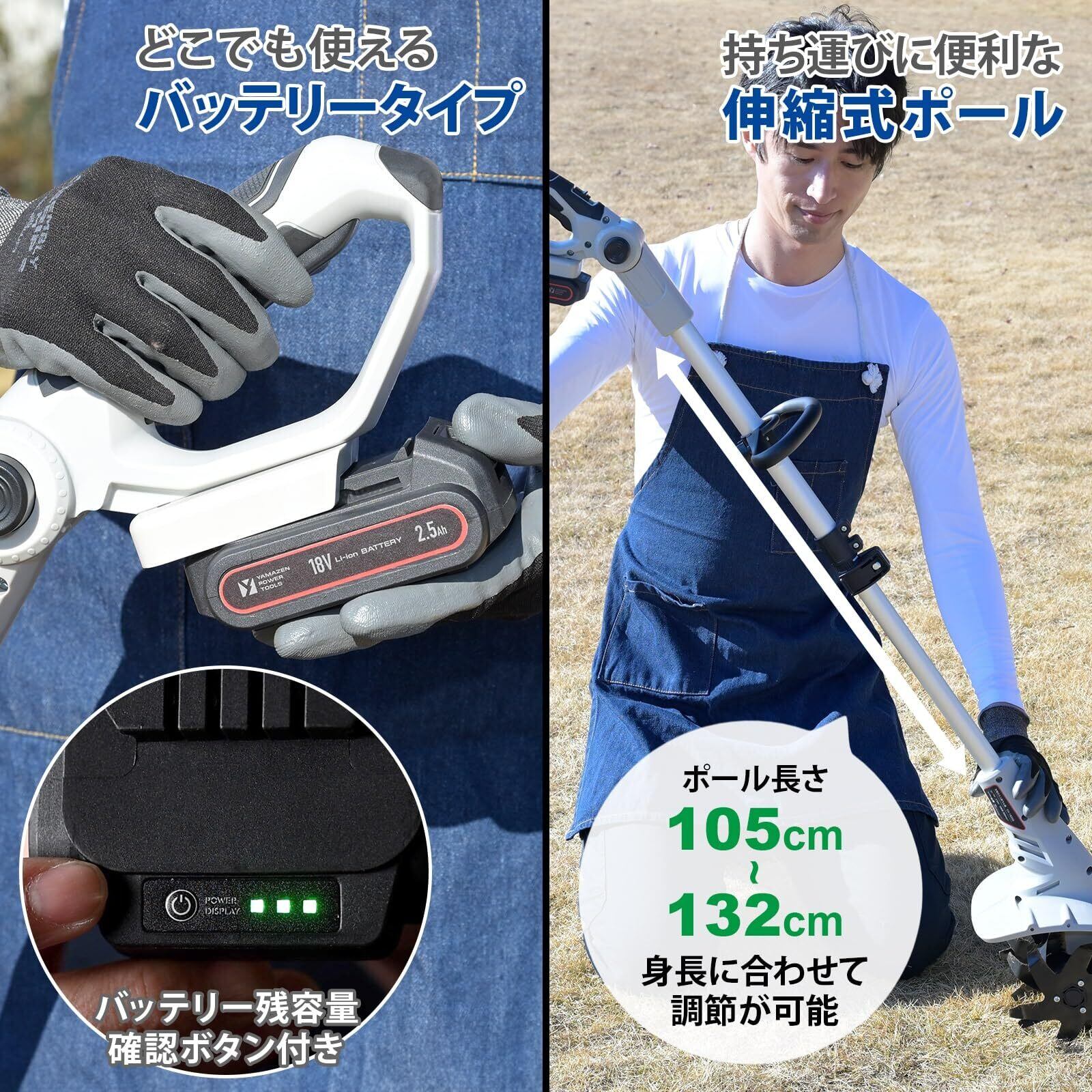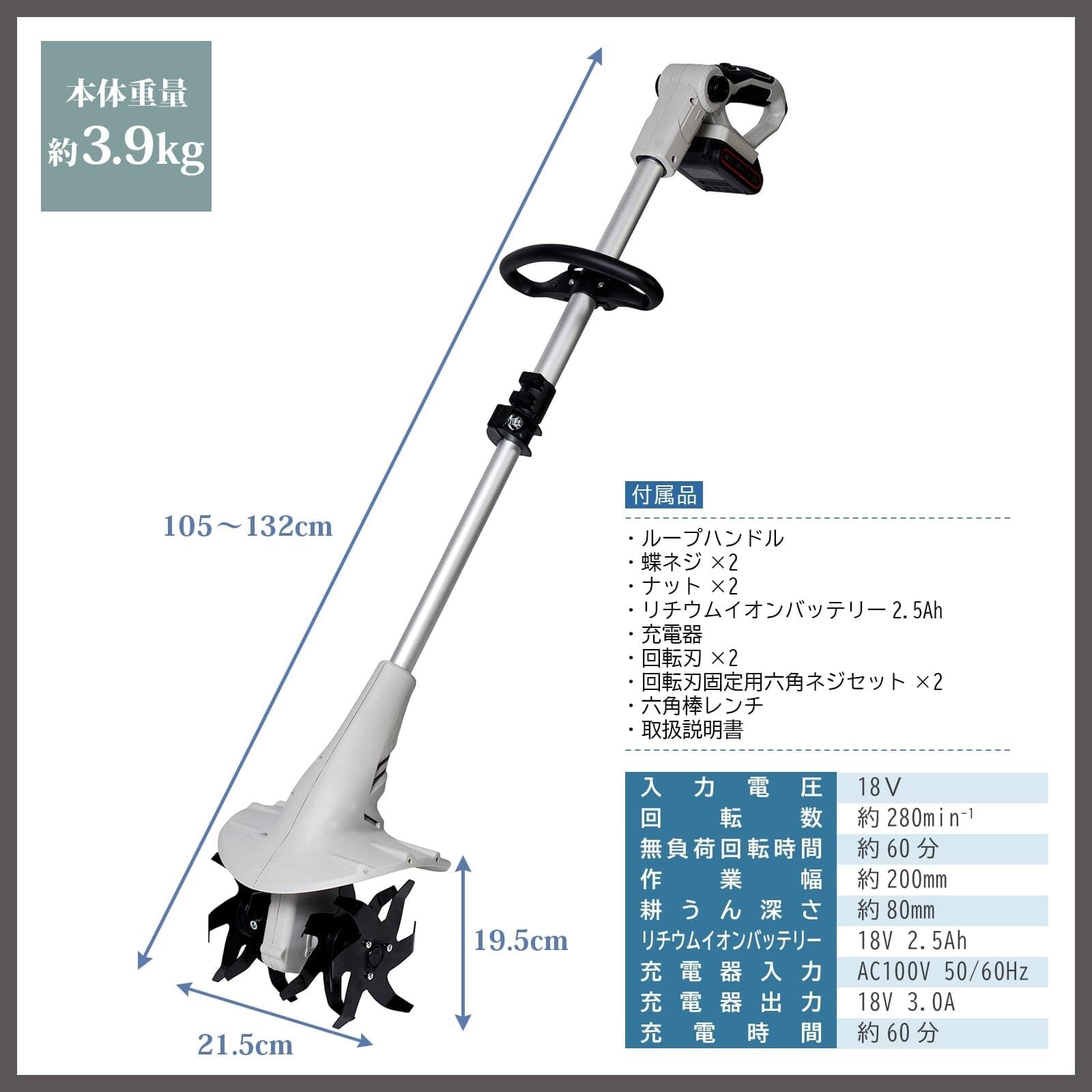 【仕様】本体サイズ:幅21.5㎝×全長105~132㎝×高さ19.5㎝/重量:約3.9㎏/作業幅:約200mm/耕うん深さ:約80mm/回転数:約280min-1/入力電圧:18V/無負荷回転時間:約60分/リチウムイオンバッテリー:2.5Ah 18V/充電器入力:AC100V 50/60Hz/充電器出力:18V 3.0A/充電時間:約60分/付属品:本体、ループハンドル、蝶ネジ×2、ナット×2、リチウムイオンバッテリー2.5Ah、充電器、回転刃×2、回転刃固定用六角ネジセット×2、六角棒レンチ、取扱説明書