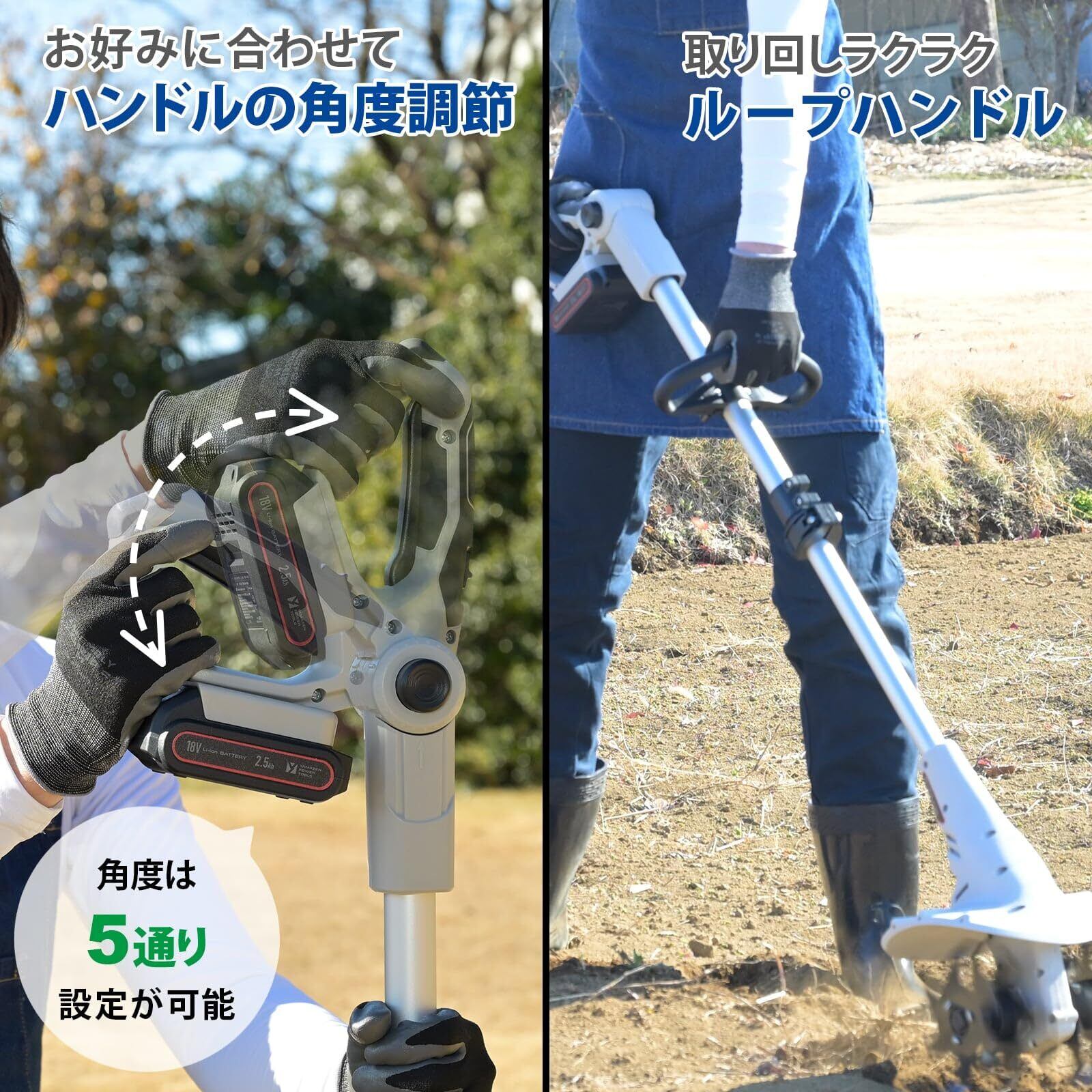 ●ハンドルはお好みの角度に調節可能でループハンドルをつかむ事で取り回しもラクラク、つらい体勢の必要なく手軽に耕うんができます。