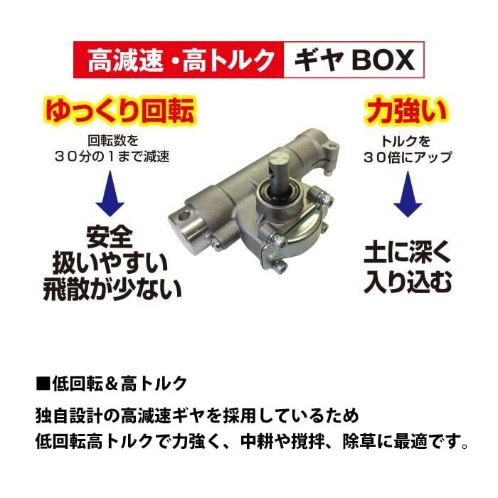 ・後退しながら耕耘することで簡易的な畝立てが行え、独自設計の高減速ギヤを採用しているため、低回転高トルクで力強く、中耕や撹拌、除草に最適