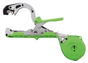 つるを支柱や番線に、テープを回して片手でホッチキスどめする機械。ぶどう・キウイフルーツなど果樹の棚誘引が早い。