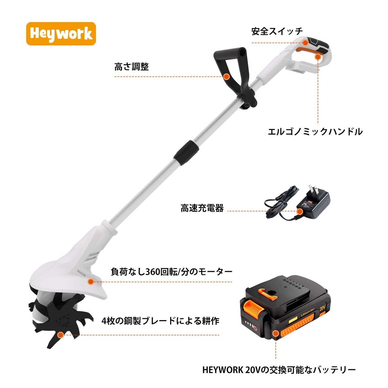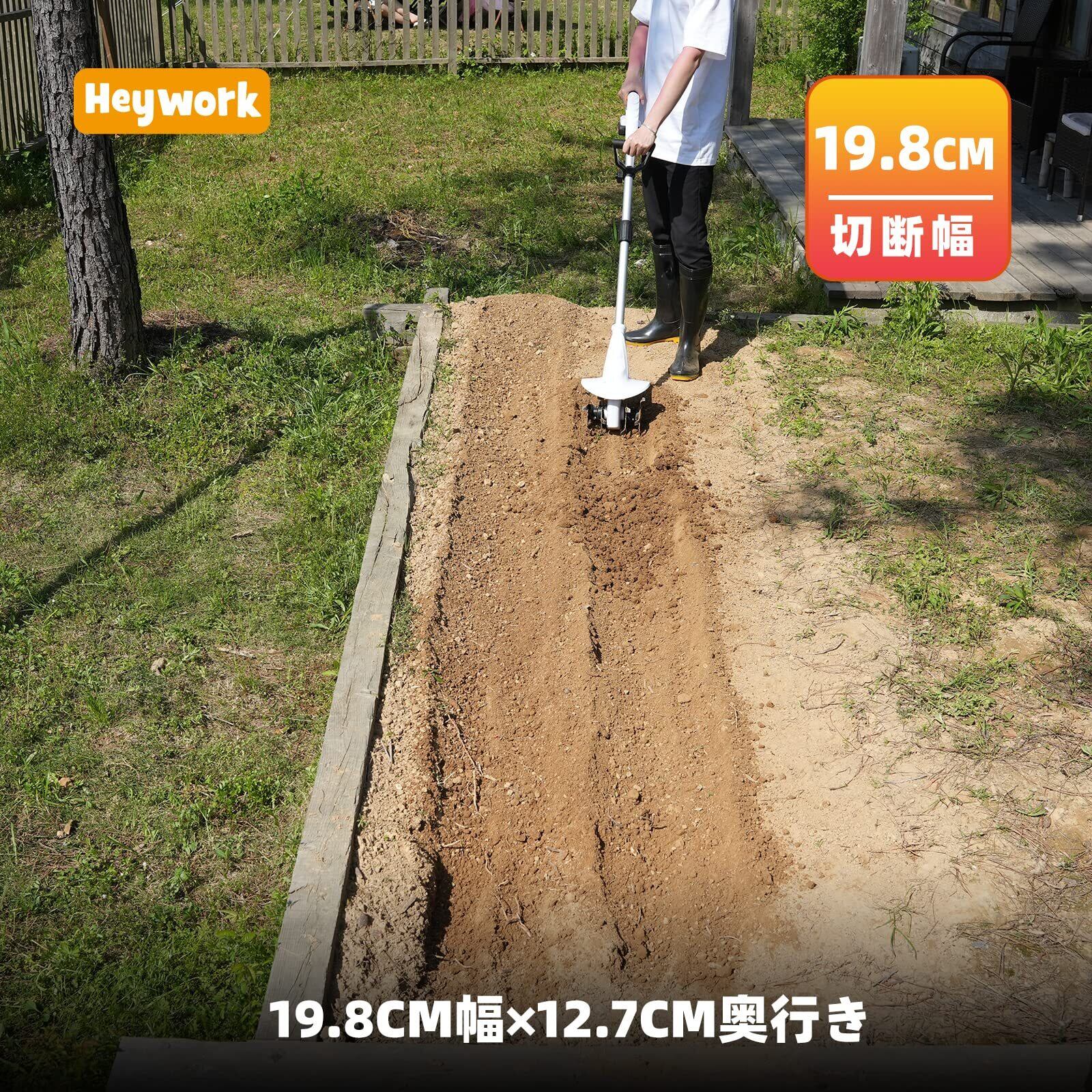 [コードレス設計]Heywork耕うん機はコードレス設計で、充電式バッテリーを使用することで、どこでもいつでも使用できます。もつれたコードにさようなら、便利な使用を手に入れましょう。