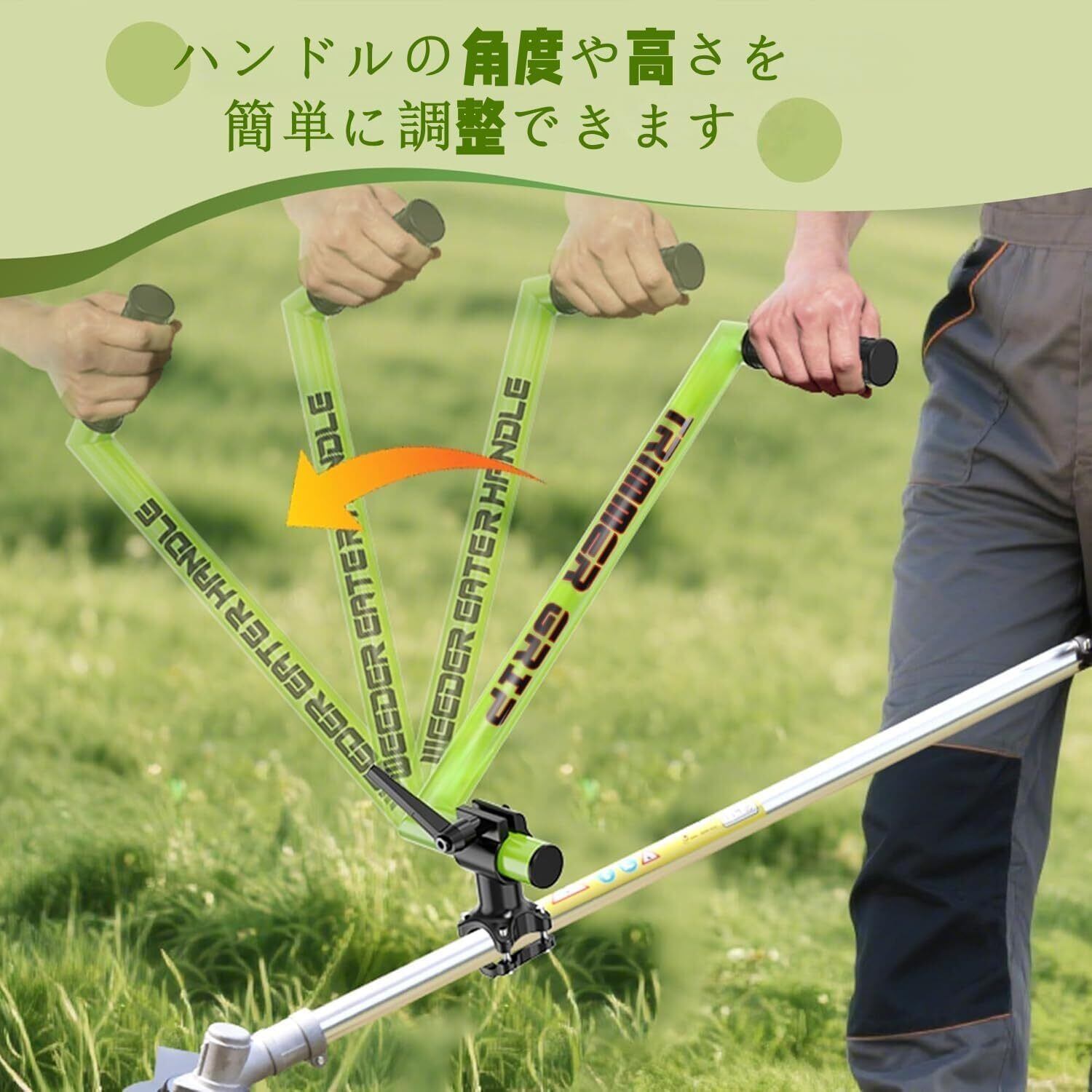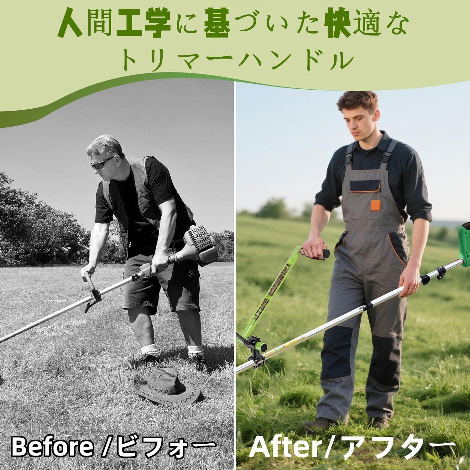 【人間工学に基づいた軽量ハンドル】この草刈機ハンドルは人間工学設計のトリマーグリップで、姿勢を正して作業できるため、疲労や体への負担を軽減し、より正確なトリミングが可能です。