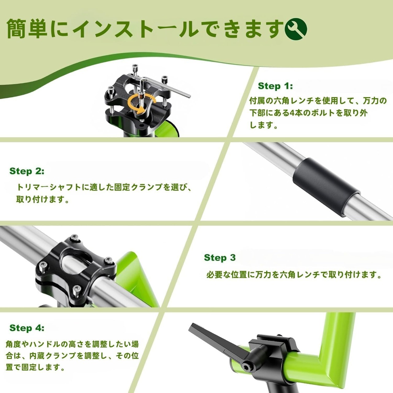 【簡単取り付け・簡単使用】本製品は長さ約45cm、幅約14cmで、4本のボルトを外しバイスの上部を取り外してから、草刈機のシャフトにバイスを取り付けて締めるだけで設置完了。トリマーハンドルの延長とアタッチメントにより、ガーデニングの幅広いニーズに対応します。