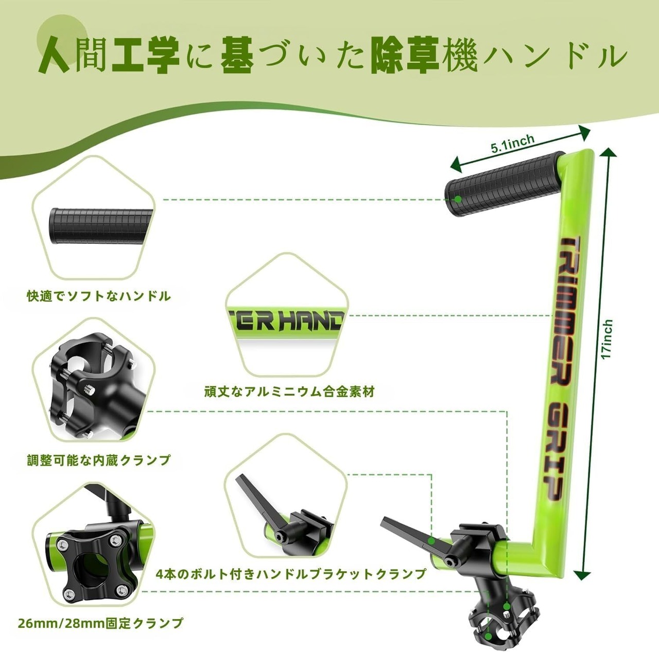 【ほとんどの草刈機に対応】このハンドル延長は、市販および業務用草刈機の99%に対応。Echo(エコー)、Ryobi(リョービ)、Stihl(スチール)、Husqvarna(ハスクバーナ)などのブランドにも対応。シャフト直径26~28mmに適合するクランプで、調整も簡単です。庭、芝生、道端、樹木周りなど様々な場所で使用可能です。