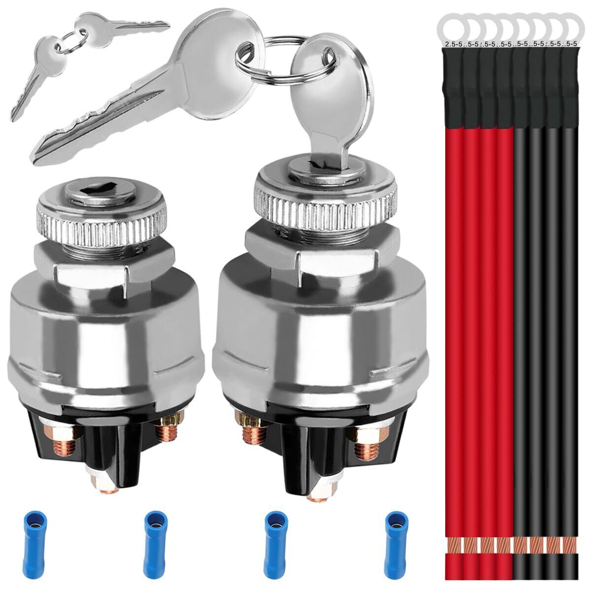 【パッケージ内容】イグニッションキースイッチ2個、キー4個、OT2.5-5端子線4個 (黒)、OT2.5-5端子線4個 (赤)、青コールドプレスコネクタ4個。