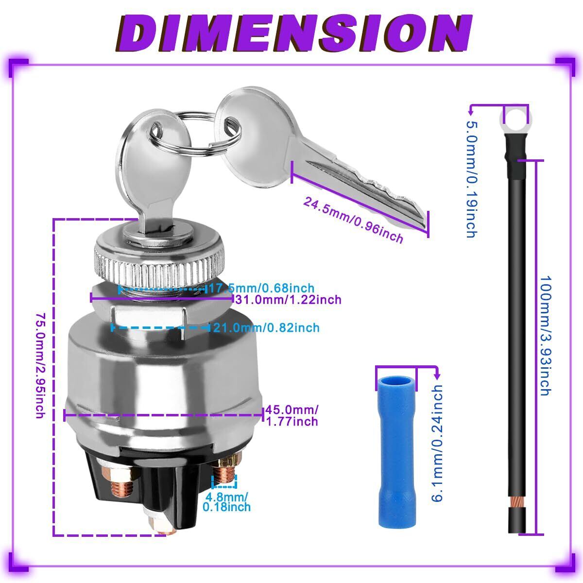 【寸法】イグニッションキースイッチ:45.0mm x 75.0mm /1.77インチ x 2.95インチ(幅 x 高さ); ネジ径:17.5mm/0.68インチ; OT2.5-5ブルー端子コネクタ径:6.1mm/0.24インチ; 端子ラグ:5.0mm/0.19インチ; ケーブル長さ:100mm/3.93インチ; ワイヤゲージ:14AWG。