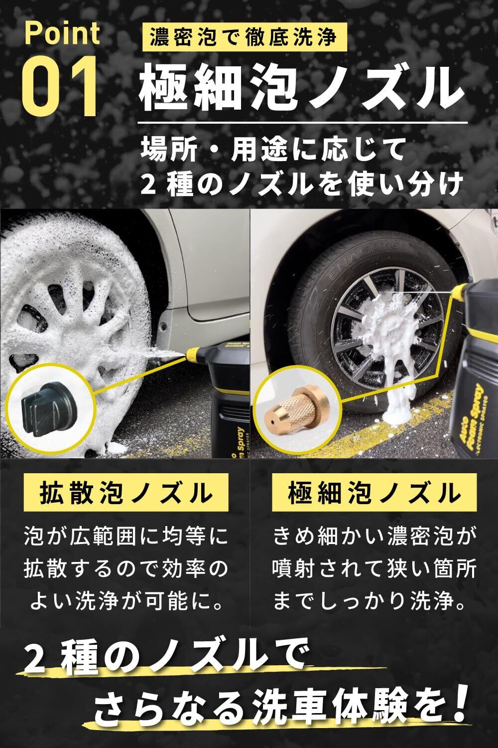 【 2種類のノズルが付属 】▶︎拡散泡ノズルは均等かつ広範囲噴射が可能。極細泡(金属)ノズルはきめ細かく高密度の噴射が可能。【 簡単なボタン操作のみ 】 ▶︎スイッチを長押しで噴射。二回連続早押しで、指を離しても連続噴射が可能。