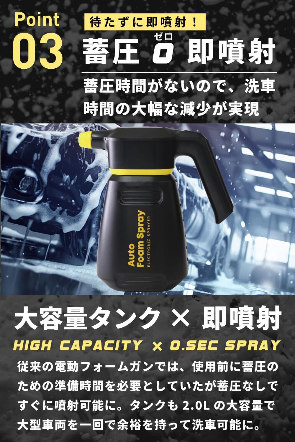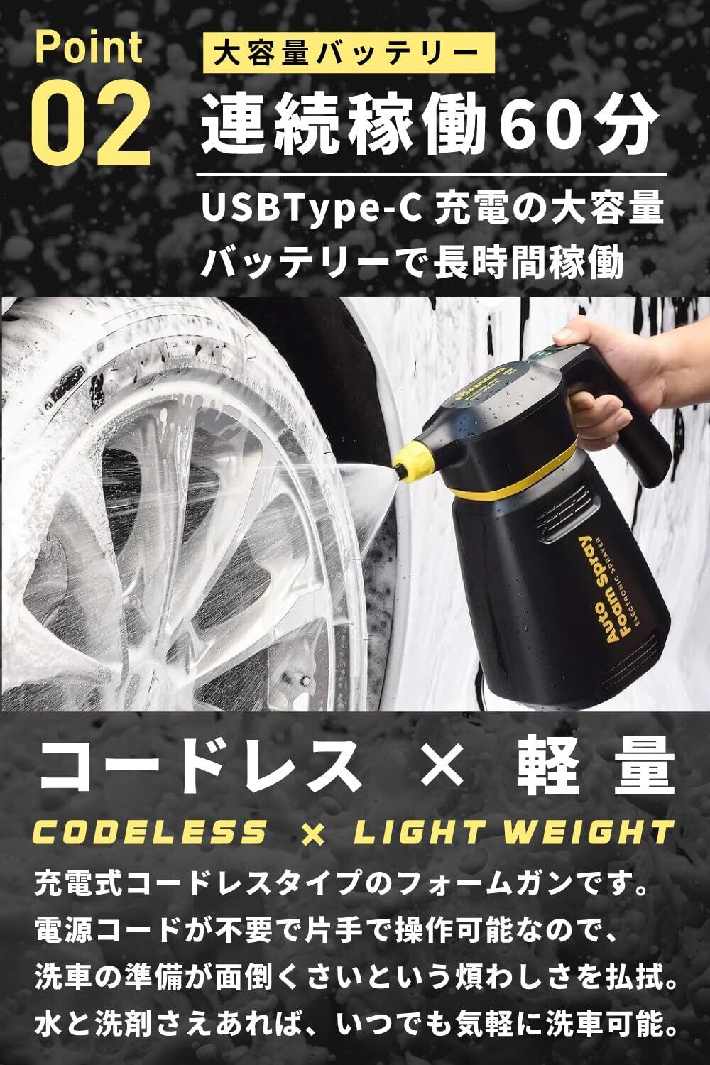 【 洗車の助っ人 自動泡噴霧器 】▶︎新型の充電式コードレスタイプフォームガン!蓄圧なしで即噴射することができるので洗車時間を大幅に短縮することができます。【 モコモコ泡で洗車 】▶︎きめ細かい泡立ち噴射でボディを包み込むため洗車傷の発生を抑えることができます。