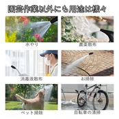「3WAYノズル切替システム」3種類の異なるノズルを標準装備。花への優しい水やりから農薬散布、デッキ掃除まで、ワンタッチで用途切替可能。ノズルを回転させるで水流強弱を自由に調整できます。