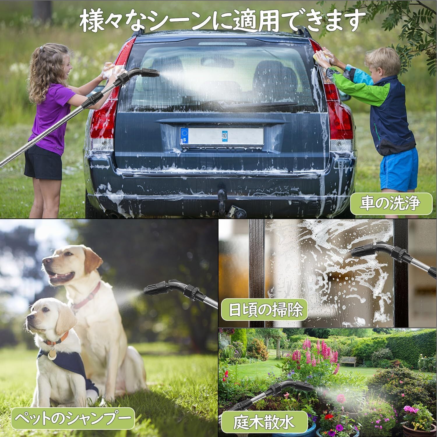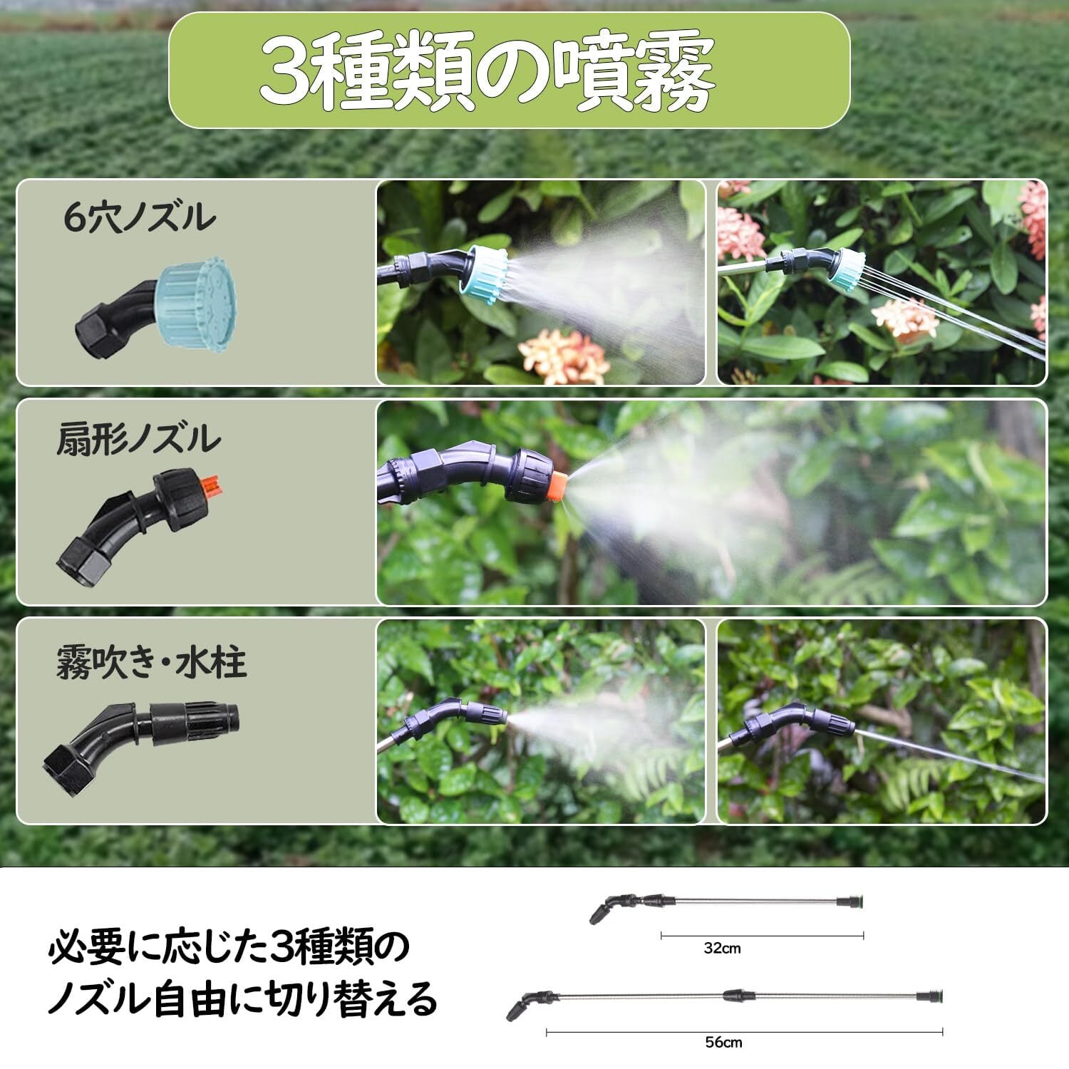 【調整可能なノズル】三種類のノズルが付属します。用途に応じて、扇形霧状噴射、ストレート噴射、ストレート霧状噴射、6穴シャワー噴射、四つの噴射モデルを自由に切り替えられます。植物への水やり、芝生の手入れ、除草、家の掃除など、ミストモードとスプレーモードを簡単に切り替えることができます。