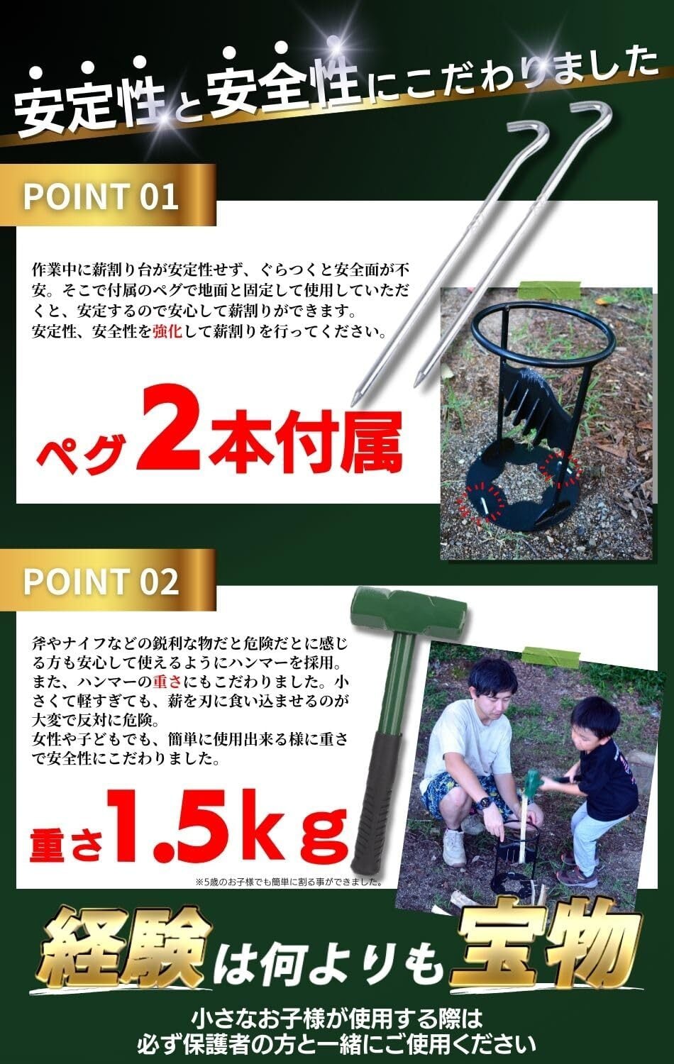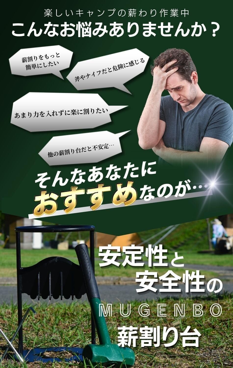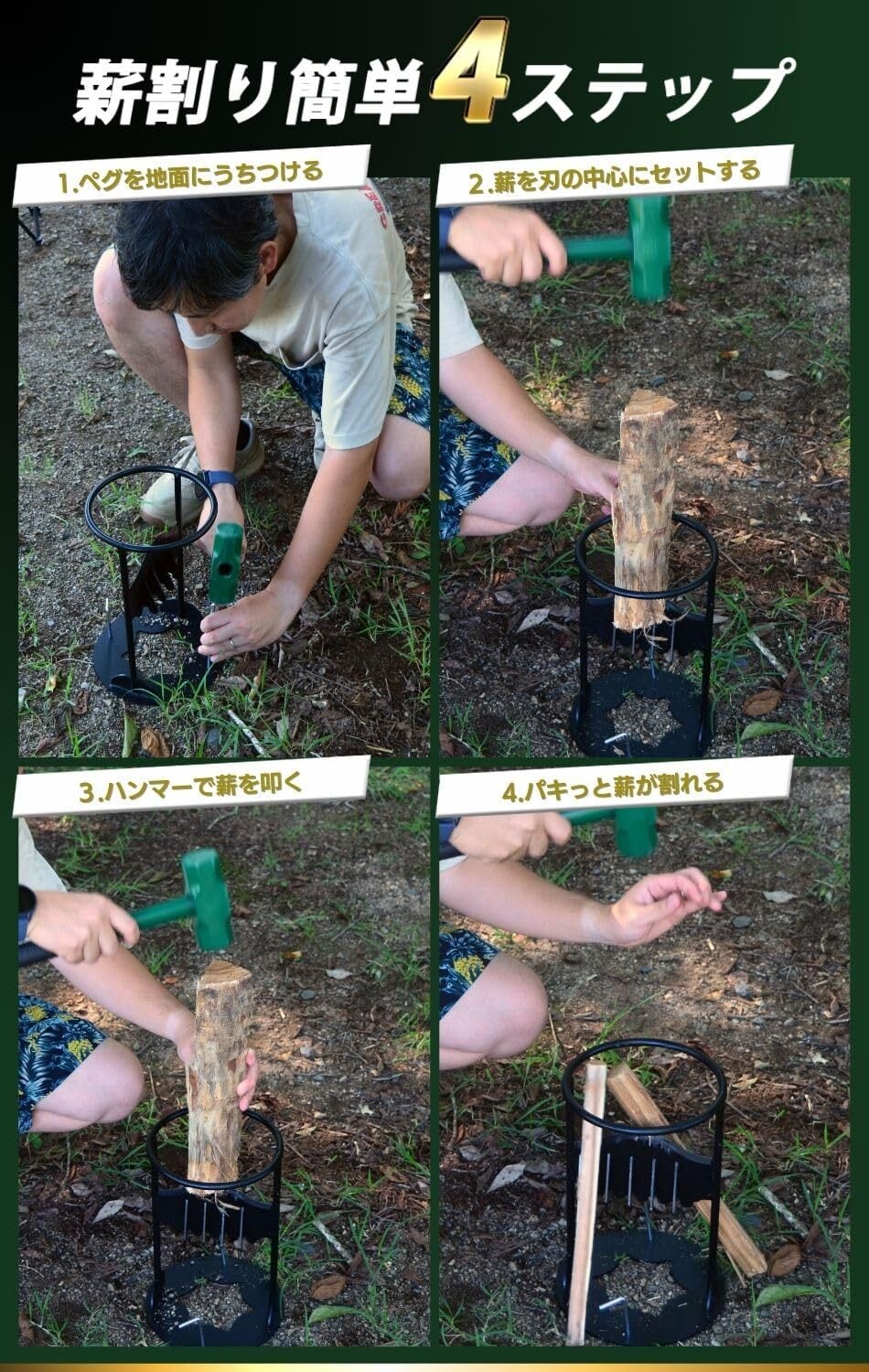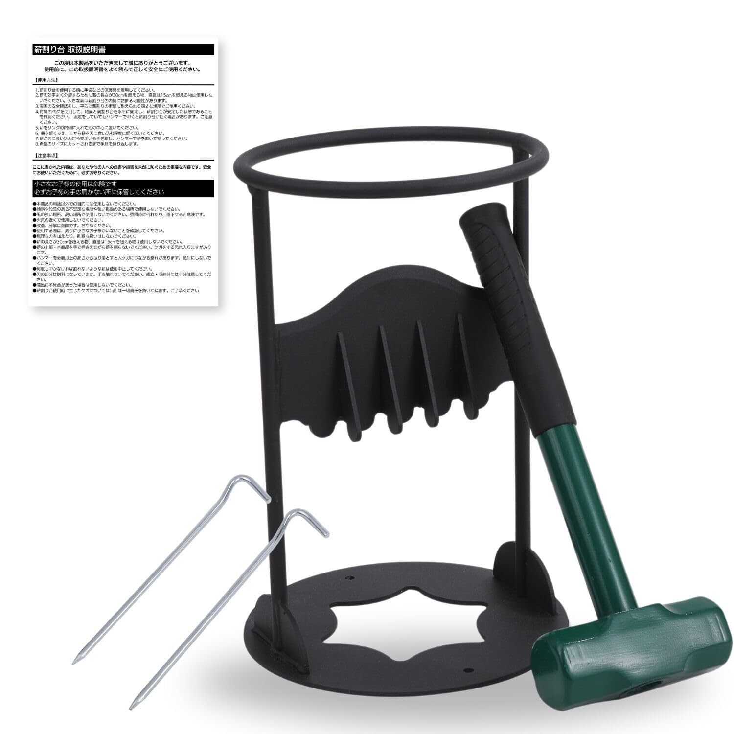 【特別価格】【キャンプ歴13年 キャンプインストラクター監修】薪割り台 薪割り 薪割り機 固定式 ペグ2本 ハンマー付き キャンプ アウトドア 焚き火 薪ストーブ 暖炉 バーベキュー 安心 安全 簡単 mugenbo (薪割り機 ハンマー ペグセット)