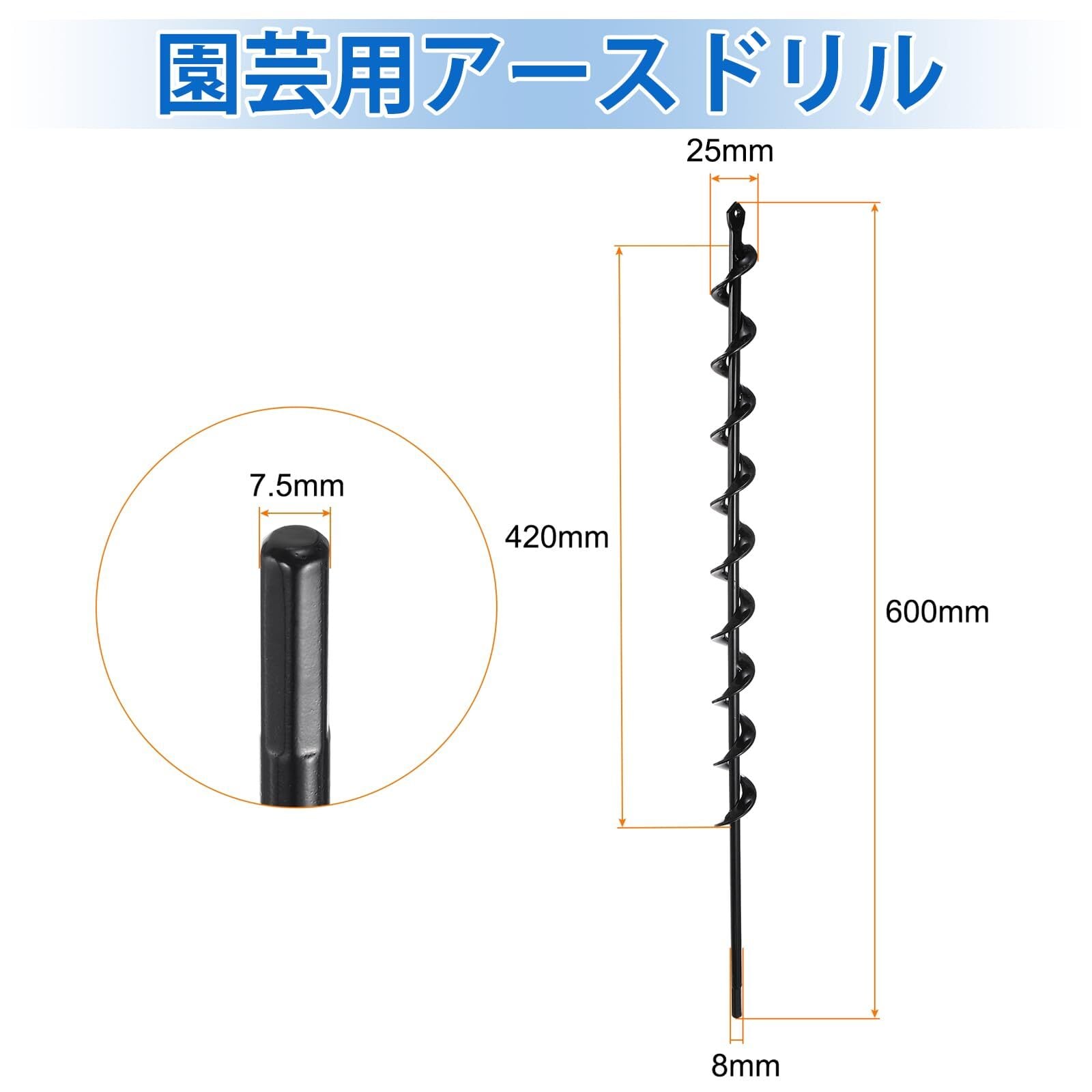 仕様:アースドリル 1本;カラー:黒;素材:炭素鋼;サイズ:全長:約600mm;幅:約420mm;直径:約25mm;ロッド径:約8mm;六角の幅:約7.5mm。アースドリルのサイズは手作業で計測しているため、多少の誤差が生じる場合があります。