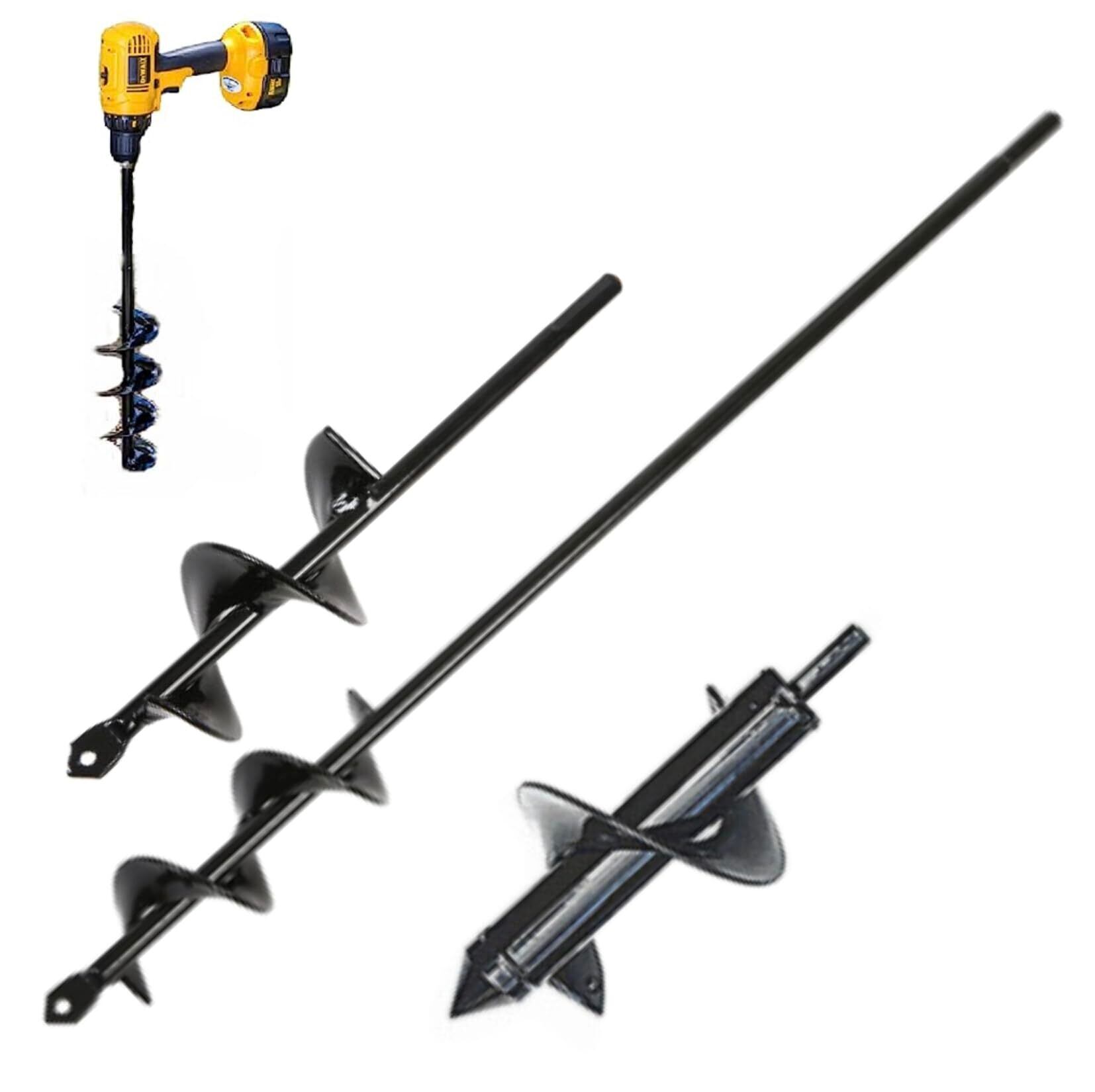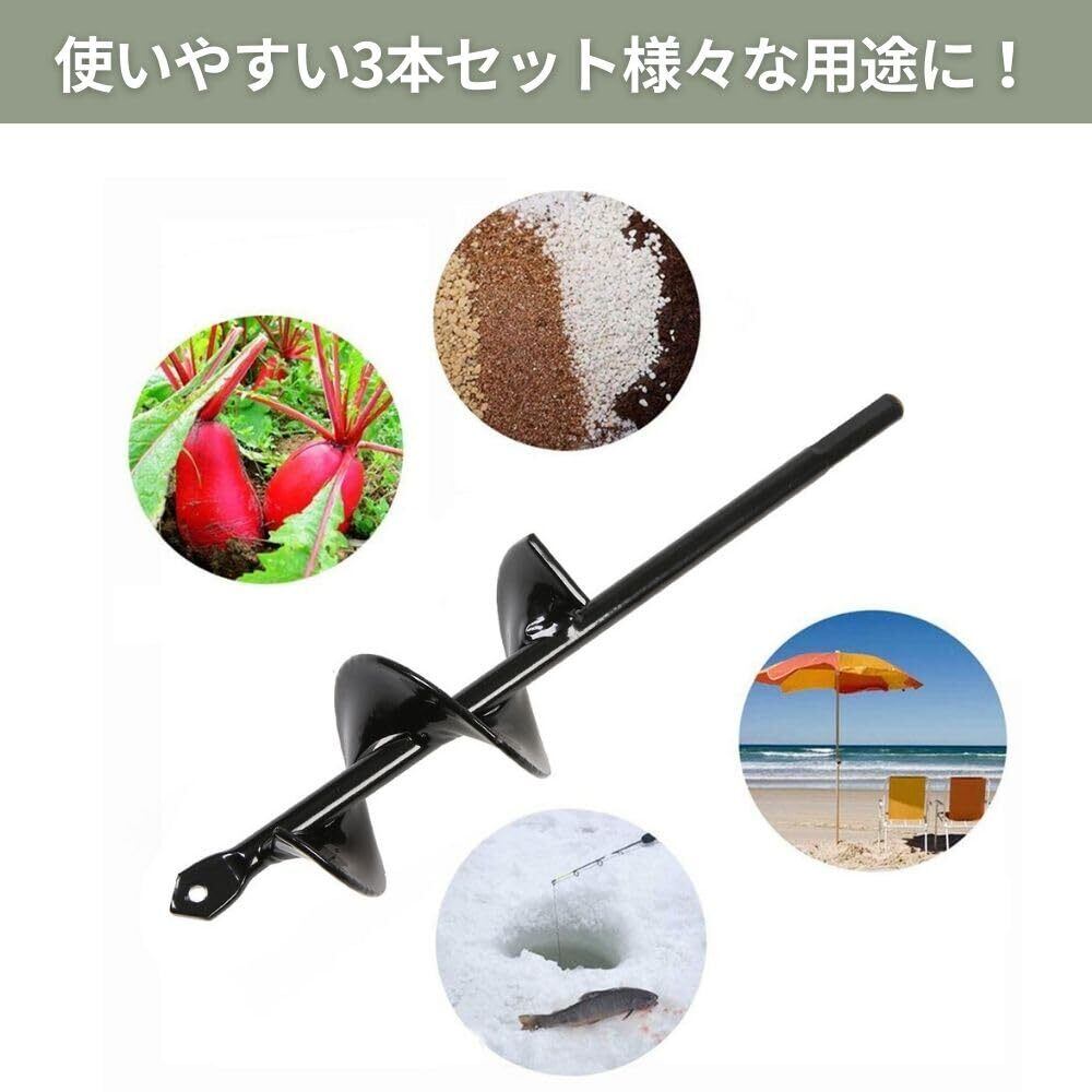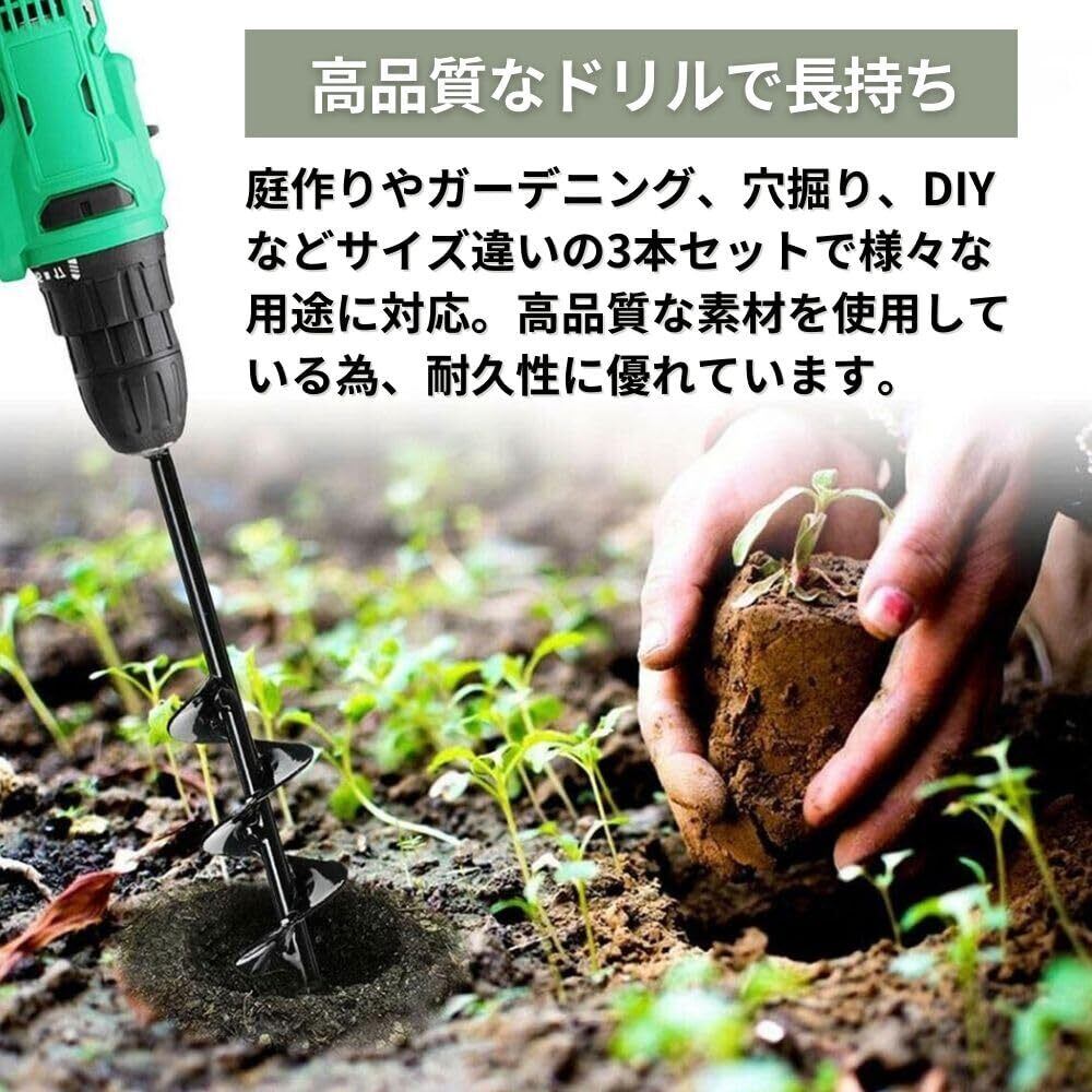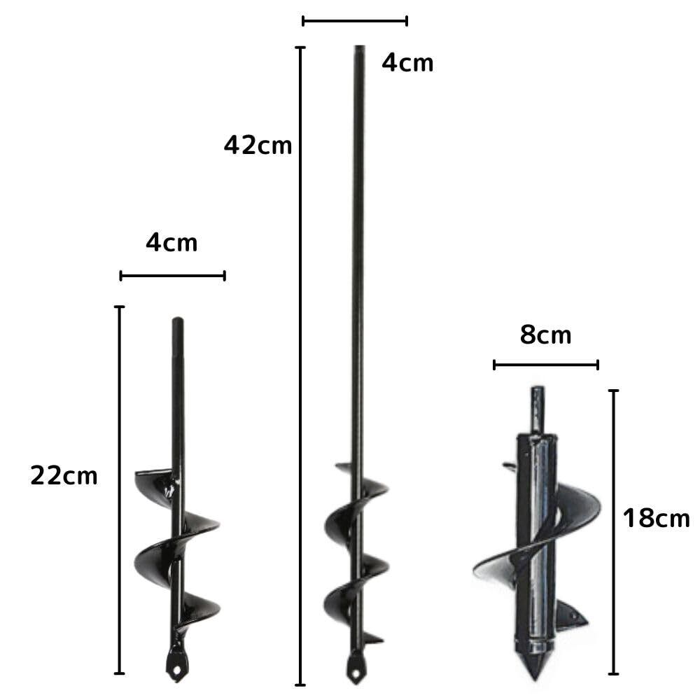 多様なサイズ:直径4×22cm、4×42cm、8×18cmという3つの異なるサイズのアースドリルがセットになっています。植木の穴掘りやフェンスのポストの設置など、さまざまな用途に適しています。