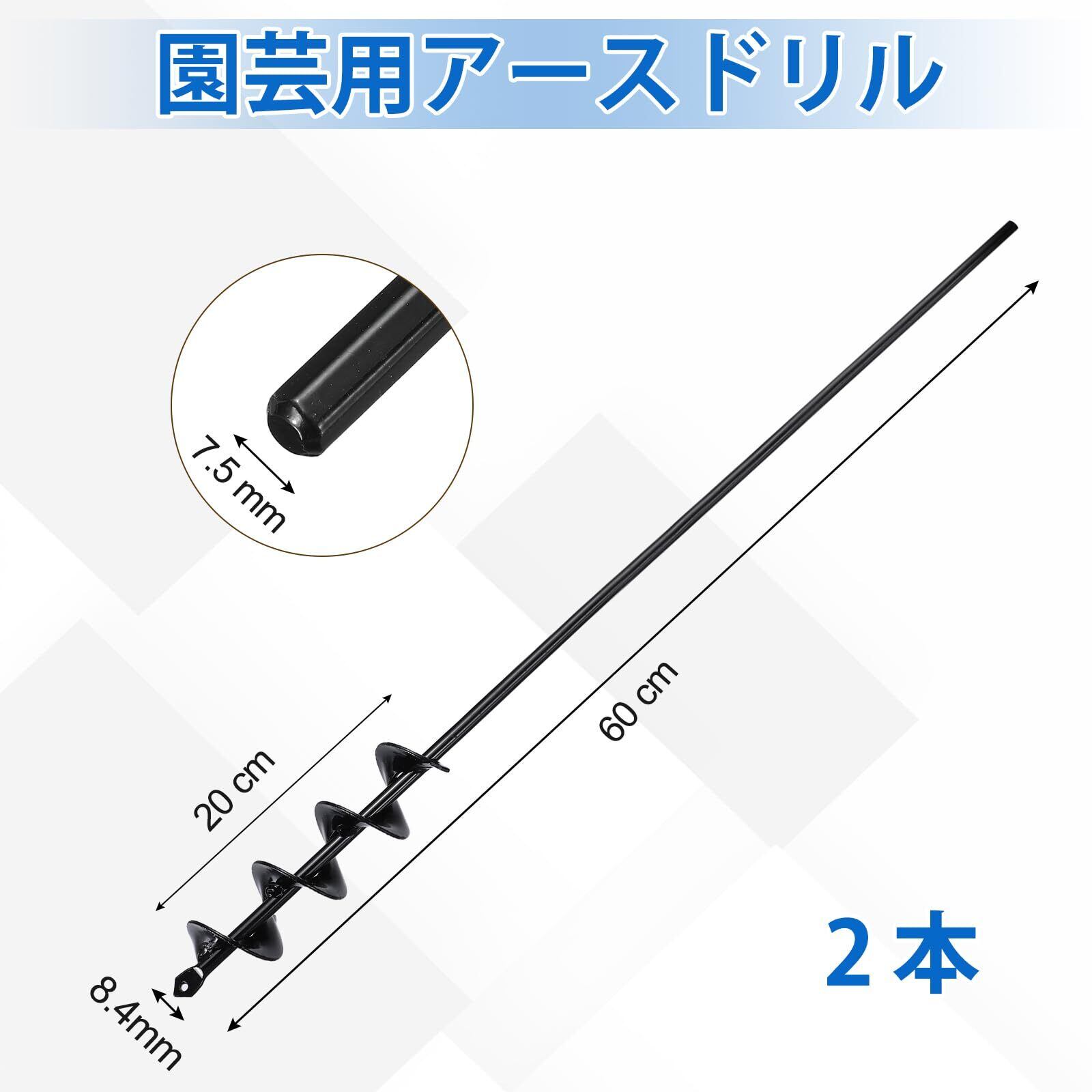 仕様:アースドリル 2本;カラー:黒;素材:炭素鋼;サイズ:全長:約75 cm;螺旋の長さ:約20 cm;直径:約5 cm;ロッド径:約8.4 mm;六角の幅:約7.5 mm。アースドリルのサイズは手作業で計測しているため、多少の誤差が生じる場合があります。