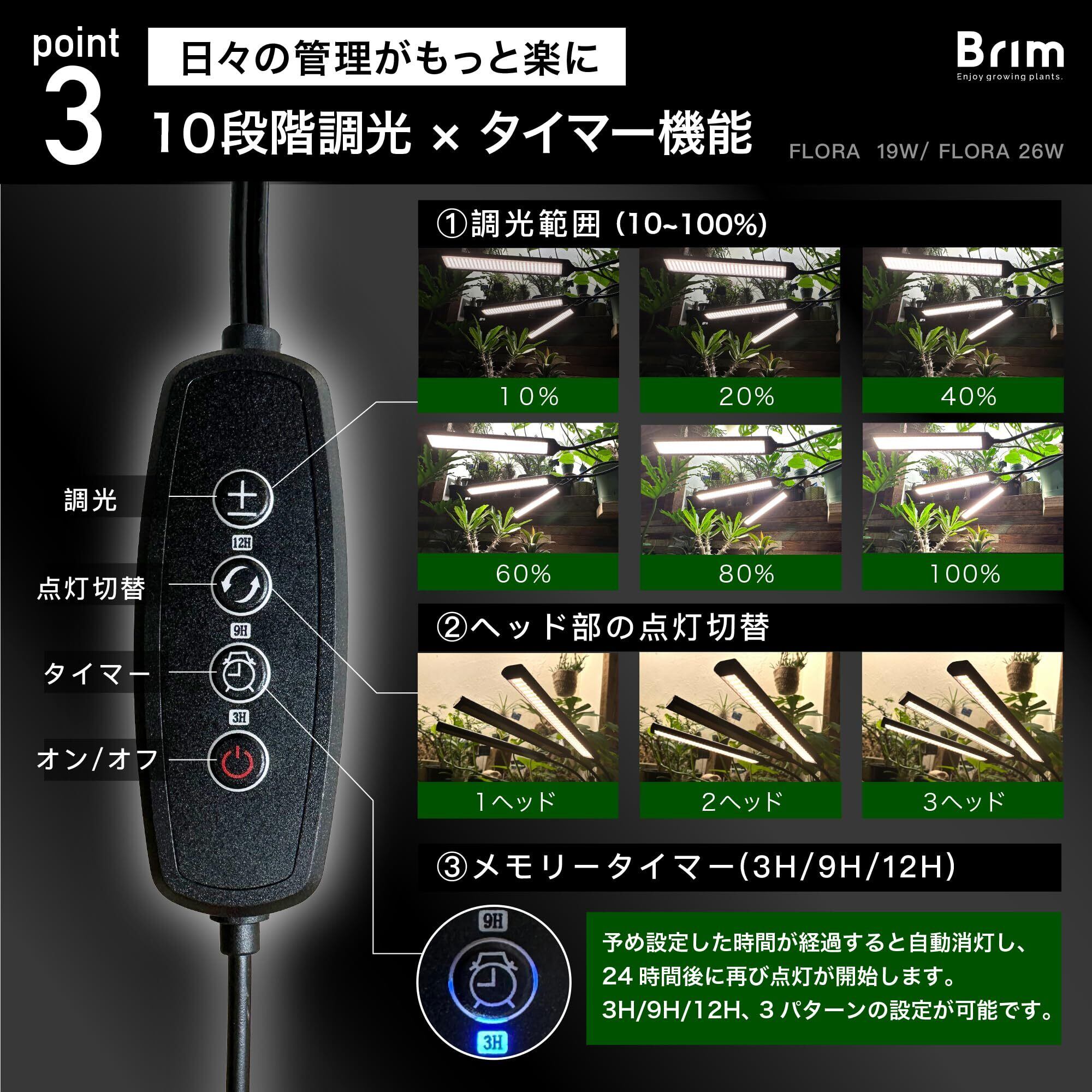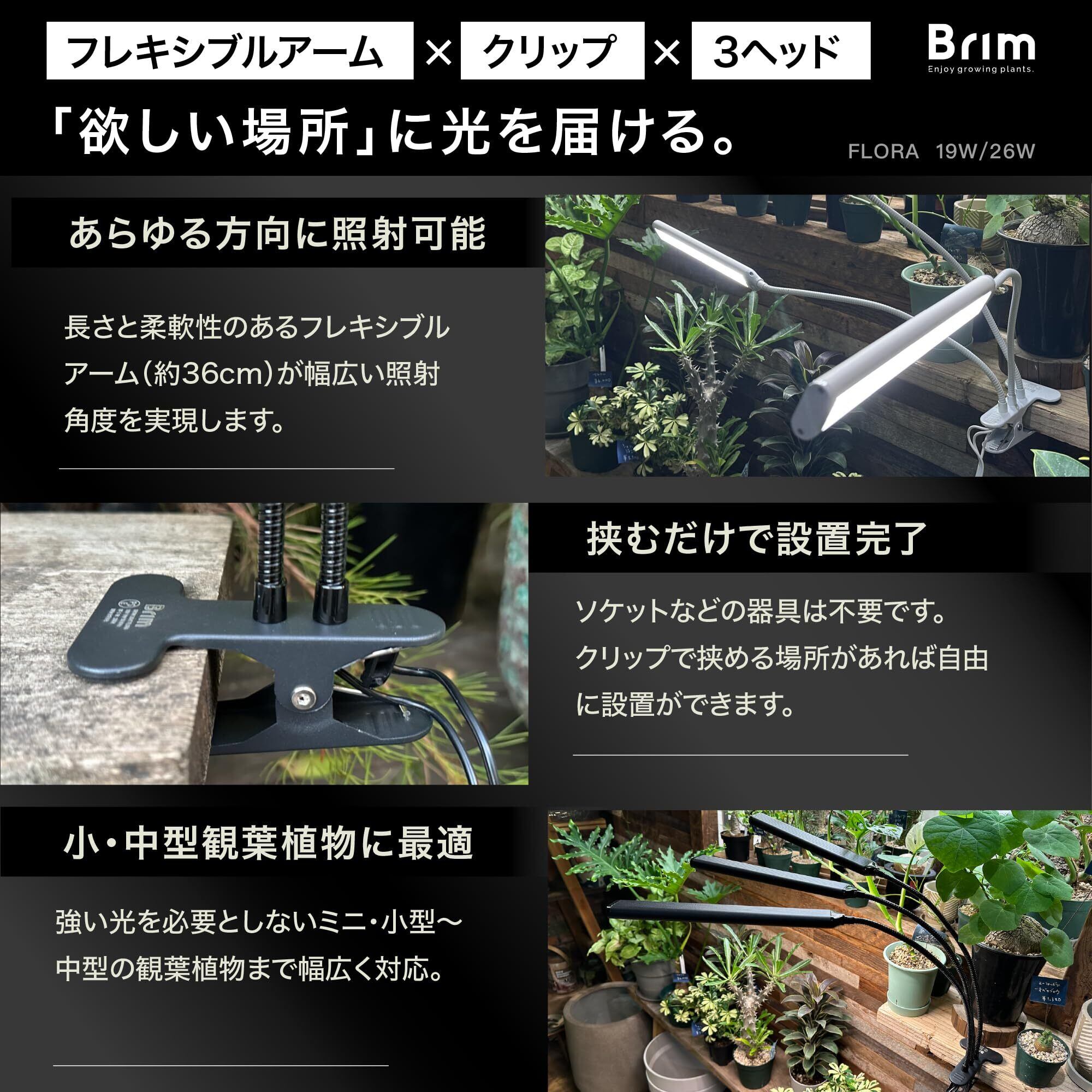 【公式】BRIM(ブリム) FLORA 植物育成ライト LED 【国内ブランド】調光 タイマー クリップ式 フルスペクトル 26W 3000K (3ヘッド, BK 暖色系)