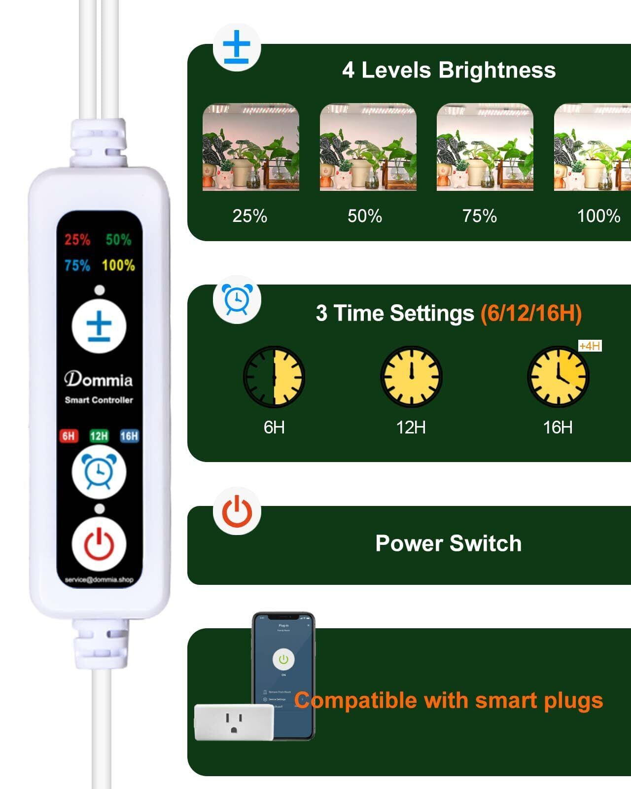 24時間サイクルタイマー-植物ケアの手間を省くために、私たちの植物 ライト24時間サイクルタイマーを使用します。タイマーを6、12、または16時間に設定して、休暇中や仕事中でも植物が十分な照明を受けることができるようにします。DOMMIA 植物育成ライト スタンドのタイマーはスマートプラグと互換性があり、自然環境の設定をコピーして、植物に最適な成長に必要なケアを提供します。