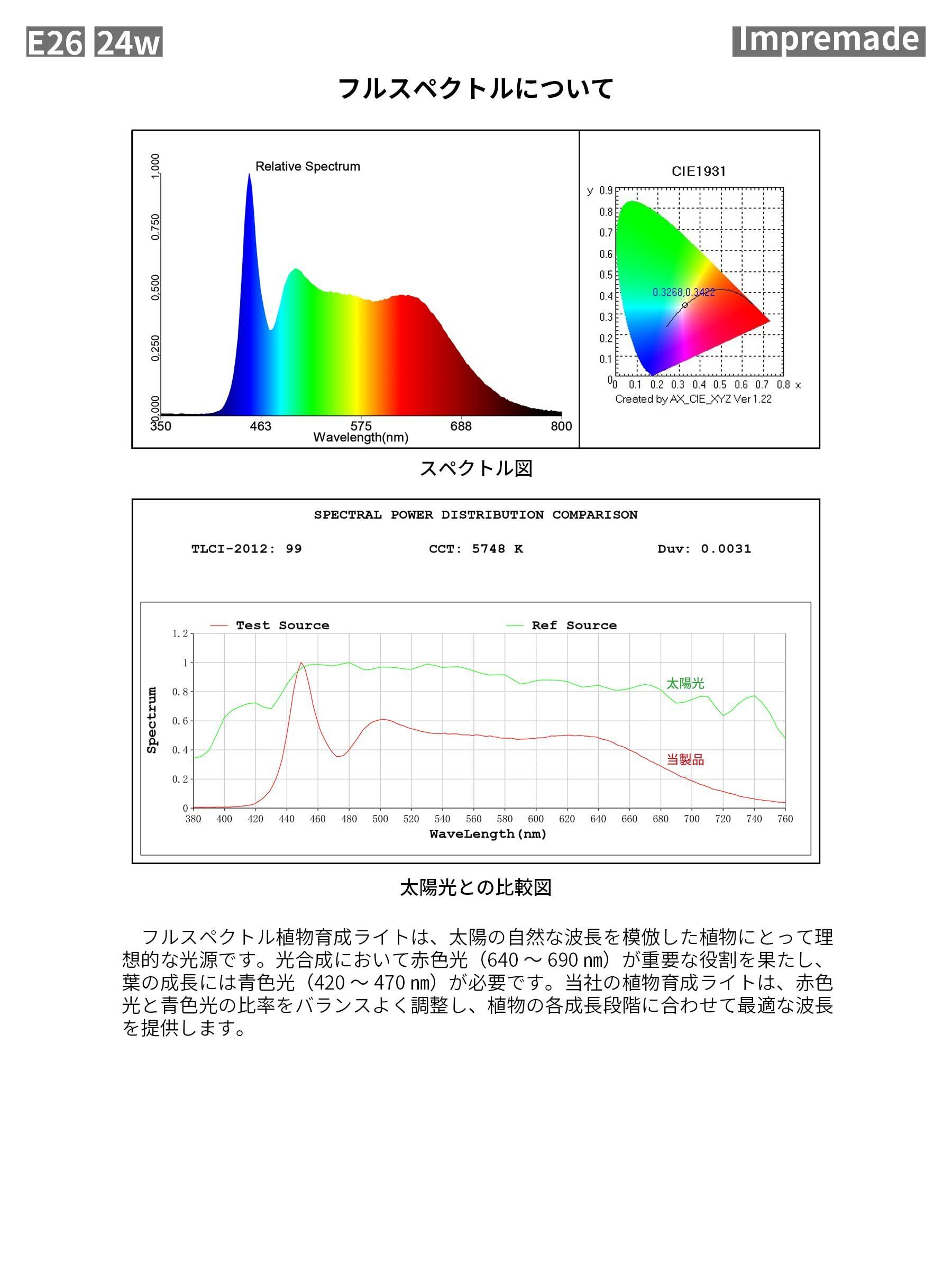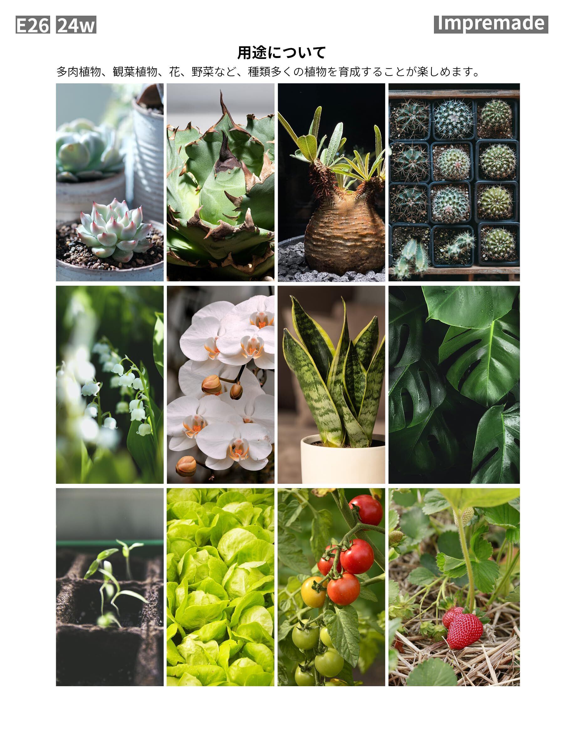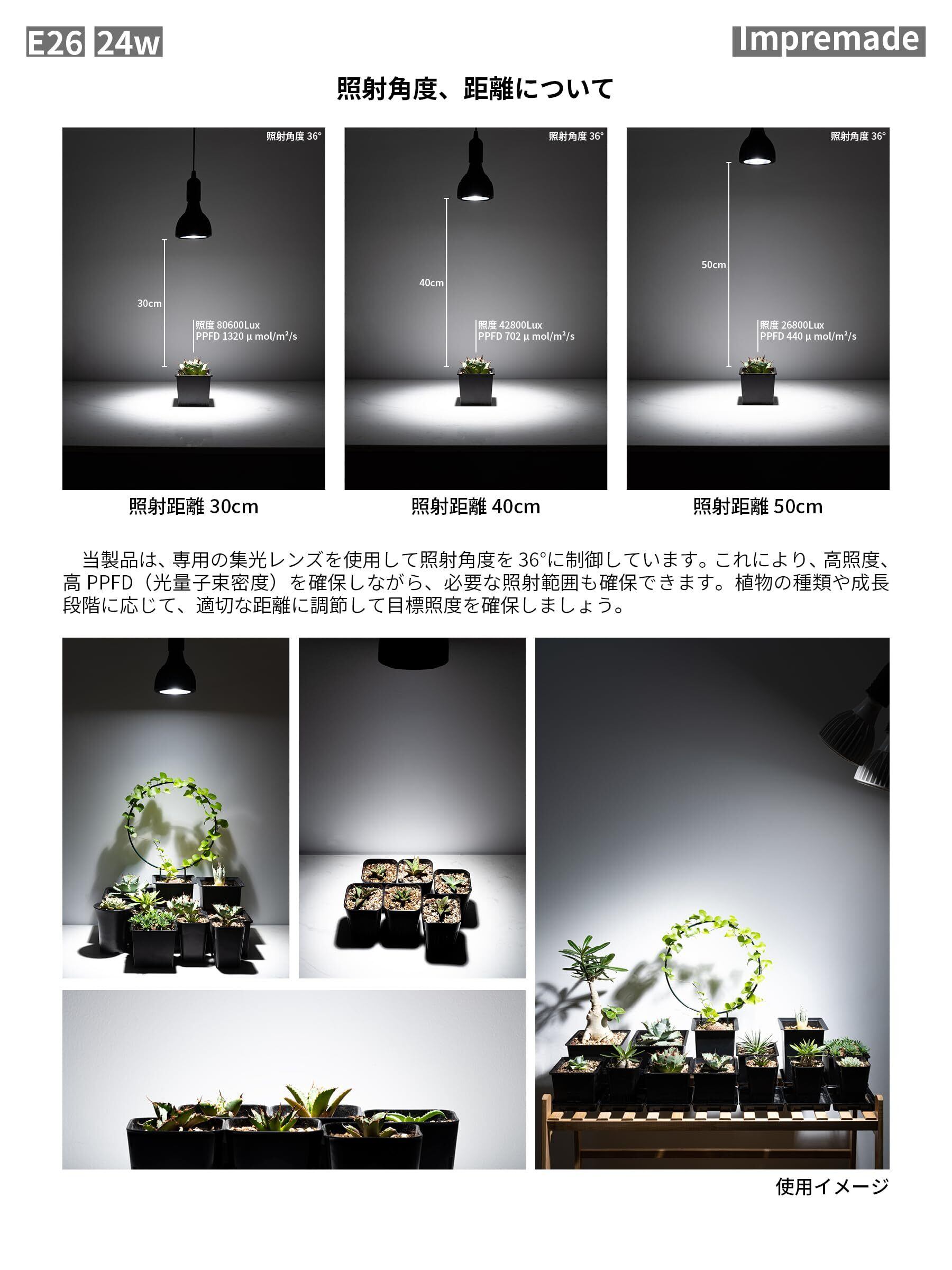 【高照度、高PPFD、高演色性】Impremade 24W 植物育成ライトは照度42800Lux、PPFD値702μmol/㎡/s(LED素子直下、照射距離40cm)、演色評価Ra98の優れた性能を持ち、太陽光の代わりに室内で植物を元気に育てることが可能です。植物が必要としている明るさが確保できるよう、照射距離を調整し、観葉植物や野菜からアガベまで幅広く多種多様な植物を育成することが可能です。さらに、徒長を防ぐにも有効です。