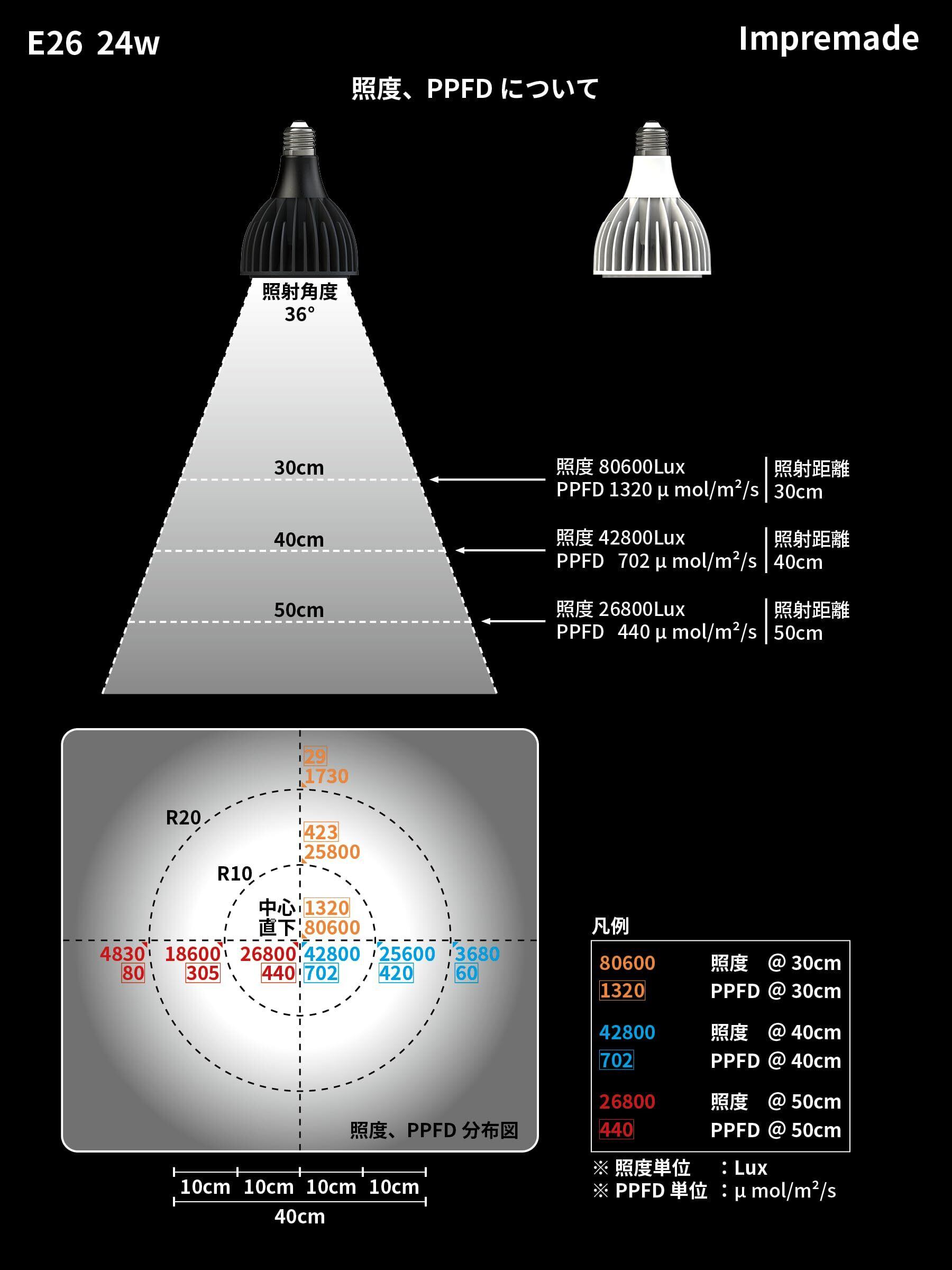 【照射範囲】当製品は専用集光レンズを使用して照射角度を36°に抑えています。高い照度、PPFDを確保するとともに、必要な照射範囲も確保しています。