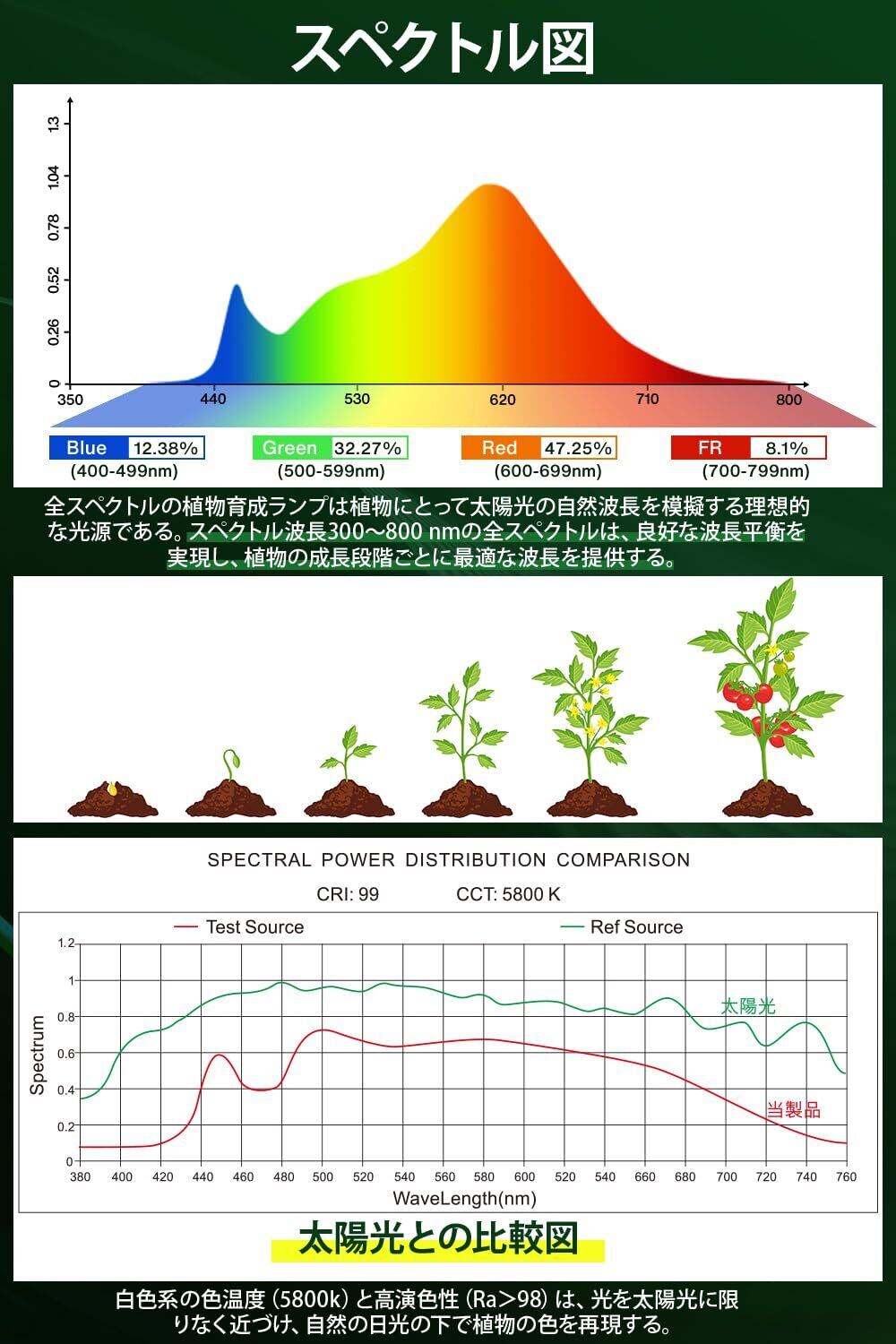 〖植物成長全段階・室内の太陽光〗:植物の育成に必要な波長は主に可視光線であり、青色光(420-470㎚)は植物葉の成長発育に役立ち、赤色光(610-680㎚)は植物茎葉の成長、開花、結果を促進する。このフルスペクトル植物成長LEDランプは、太陽光のように400nmから700nmの波長を持ち、バランスのとれた赤色光と青色光、植物の形態と構造に影響を与える緑色光と黄色光を含んでいる。植物に発芽、苗の成長、成長、開花と結果の各段階に必要な光を提供し、植物の成長の需要を満たすことができ、植物を育成する理想的な選択である。また、植物の過成長を防ぐのにも効果的です。