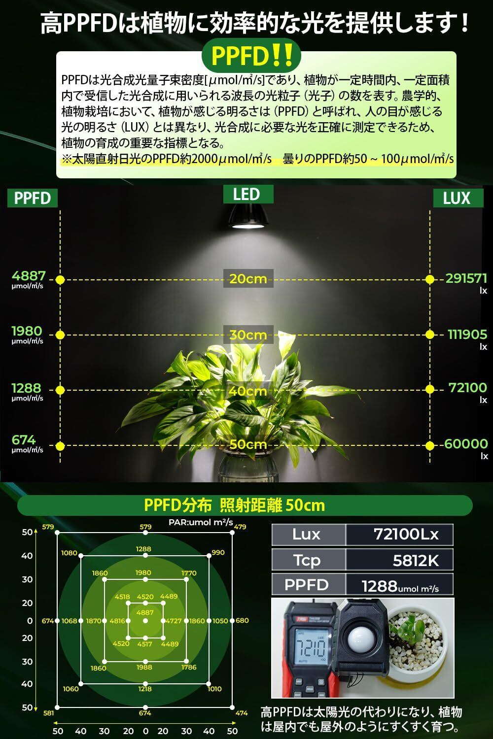 〖超高PPFD·高透光レンズ〗:の植物育成ライトは高透光レンズを用いて光を集束し、照射強度を高める。高効率ビーズを使用すると、発光効率が高く、発熱量が少なくなります。植物用ledライトのPPFD(光合成光量子束密度)値は1000µmol/㎡/s、照度は60000 Lux(※LED素子直下距離約40cm)で、太陽光の代わりに非常に高い性能を持っている。植物が悪天候や暗室で光が不足している場合、この植物成長灯は植物をいつでも室内で太陽光を照射させ、植物を屋内のように健康に成長させることができる。