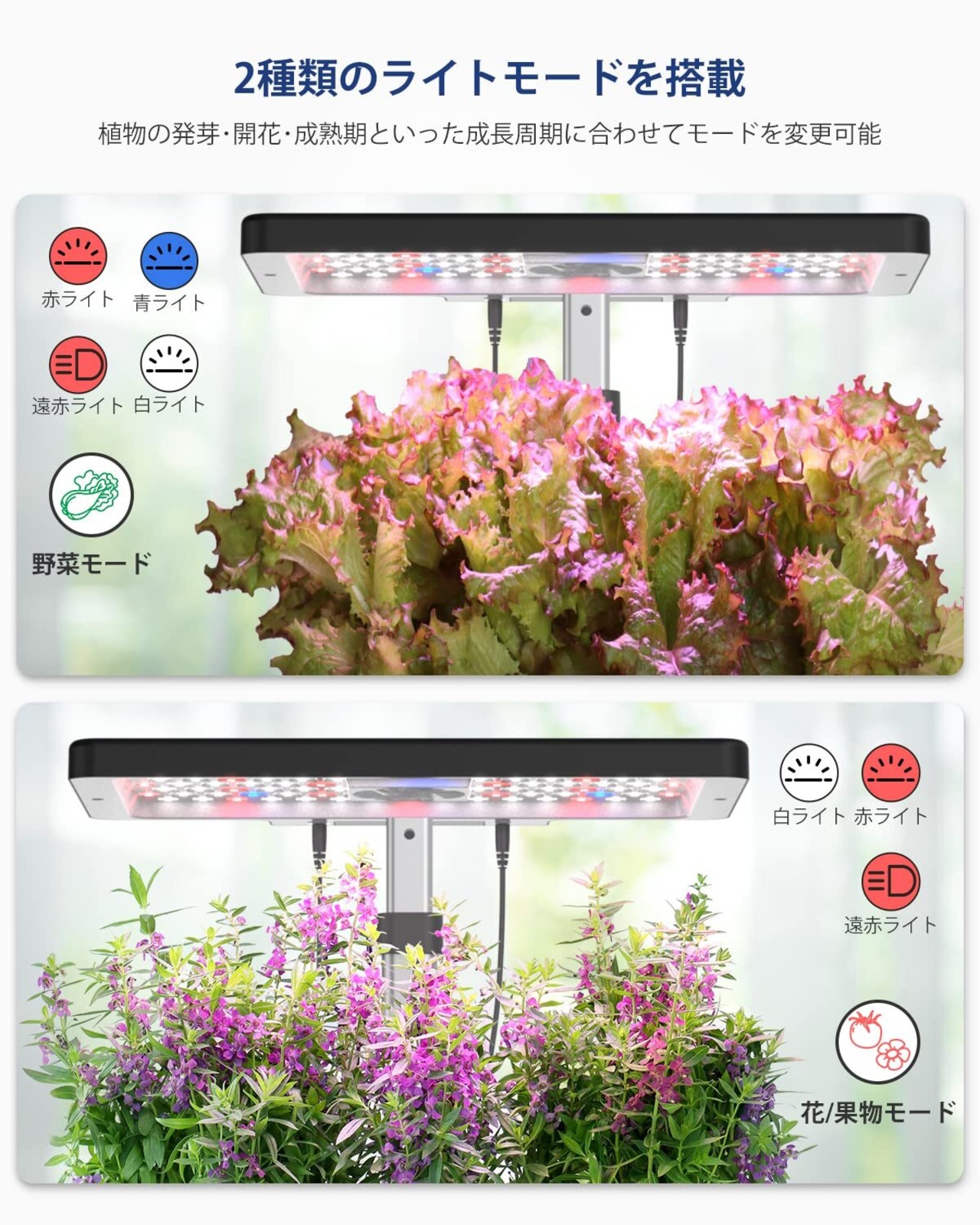 【安心の総合ヘルスケアブランド】1) 「iDOO」は、総合ヘルスケアブランド「RENPHO」のサブブランドです。 2) アメリカのトップセラー、大人気のヘルスケアブランド。 3) 全商品メーカー1年、安心の日本人スタッフによるサポート。▶野菜モードと花&果物モード◀植物の種類によって、2つのLEDライトモードを設定可能です。野菜モードは収穫物が葉菜類の植物に使用します。生命力が強い植物は果物モードを選びます。2つのモードは簡単に切り替え可能です。また、ライトが睡眠に影響を与える場合は、野菜モード/花&果物モードボタンをもう一度押すとオフになります。10時間後に自動的にライトが作動します。電源をオフにした後に電源の入れ忘れを防止し、長期間経った後にライトを再びオンにするのを忘れても植物を保護するように設計されています。