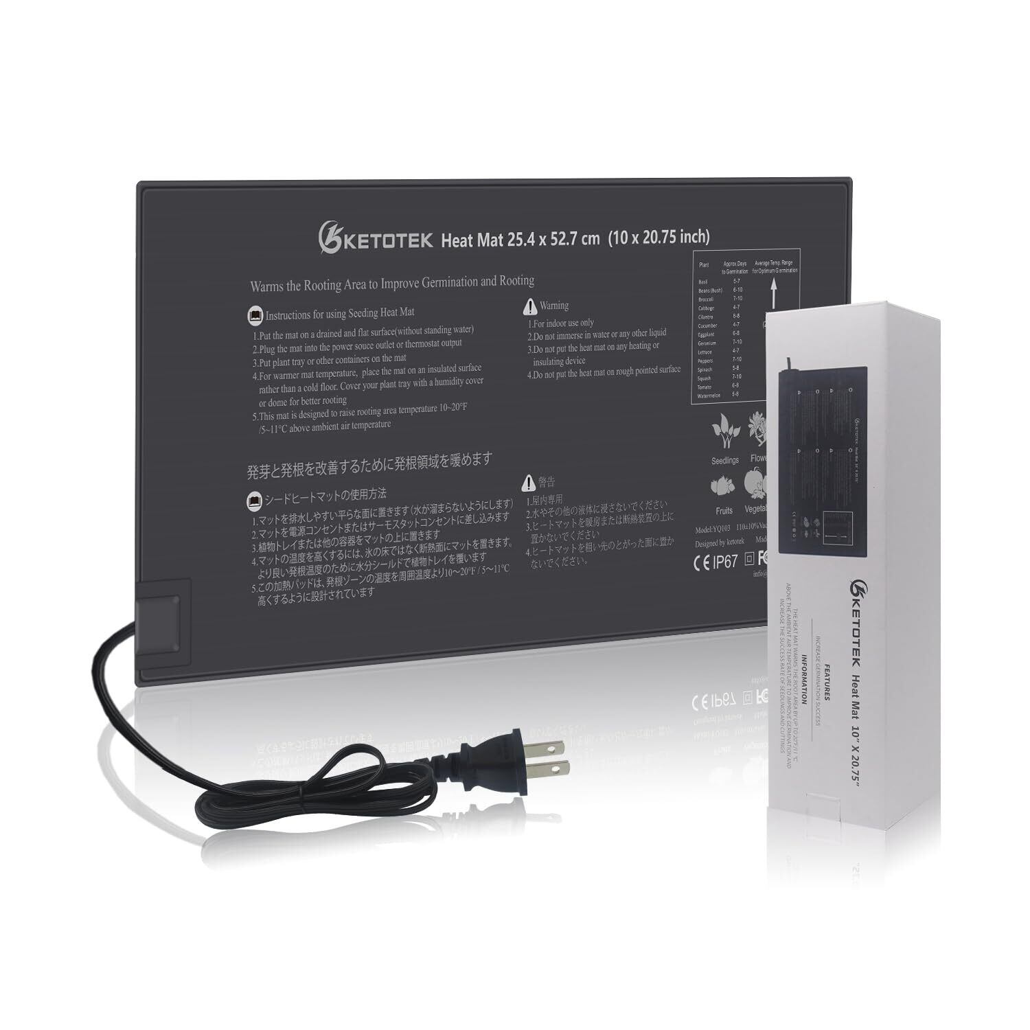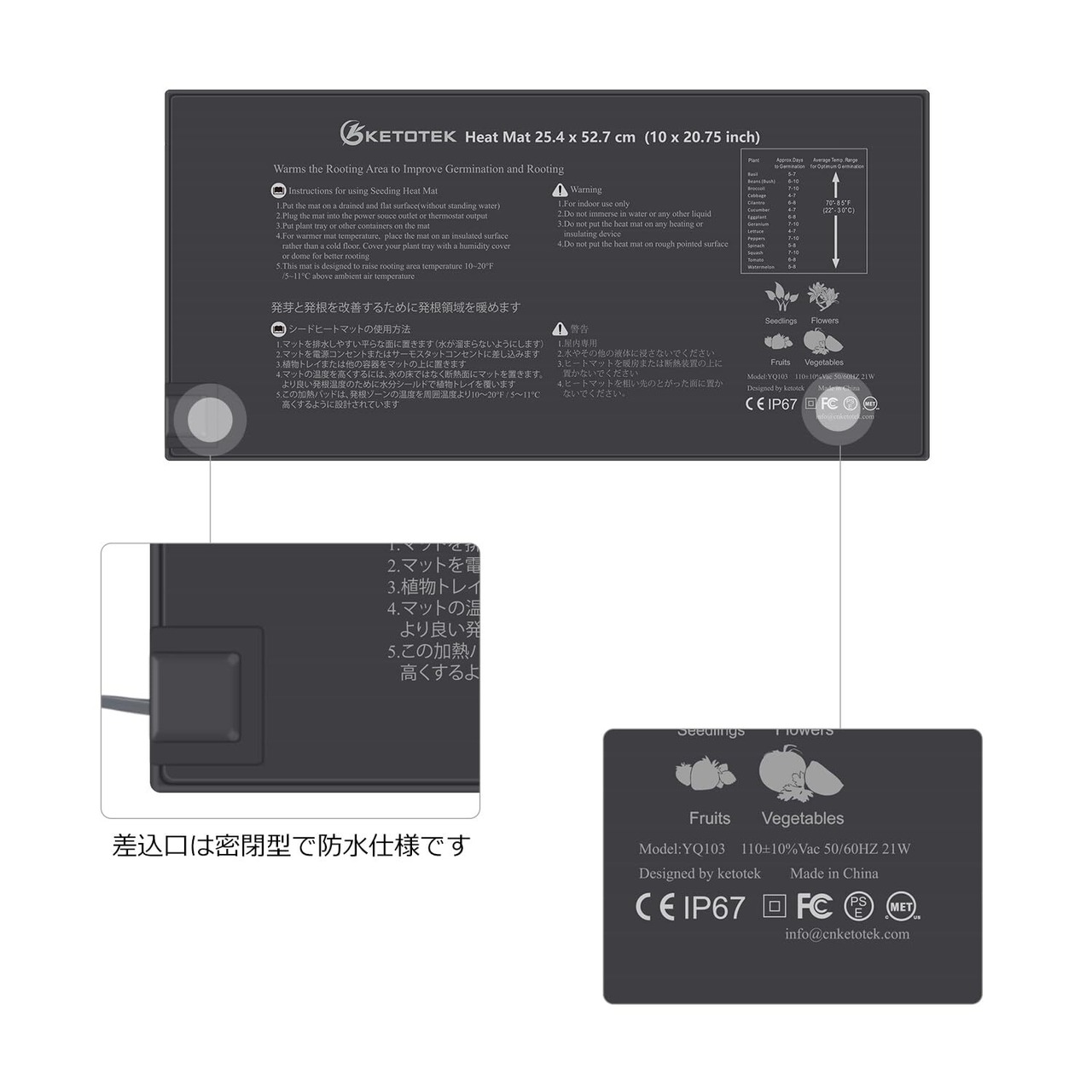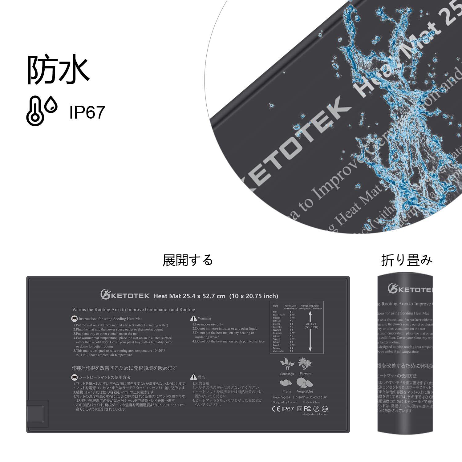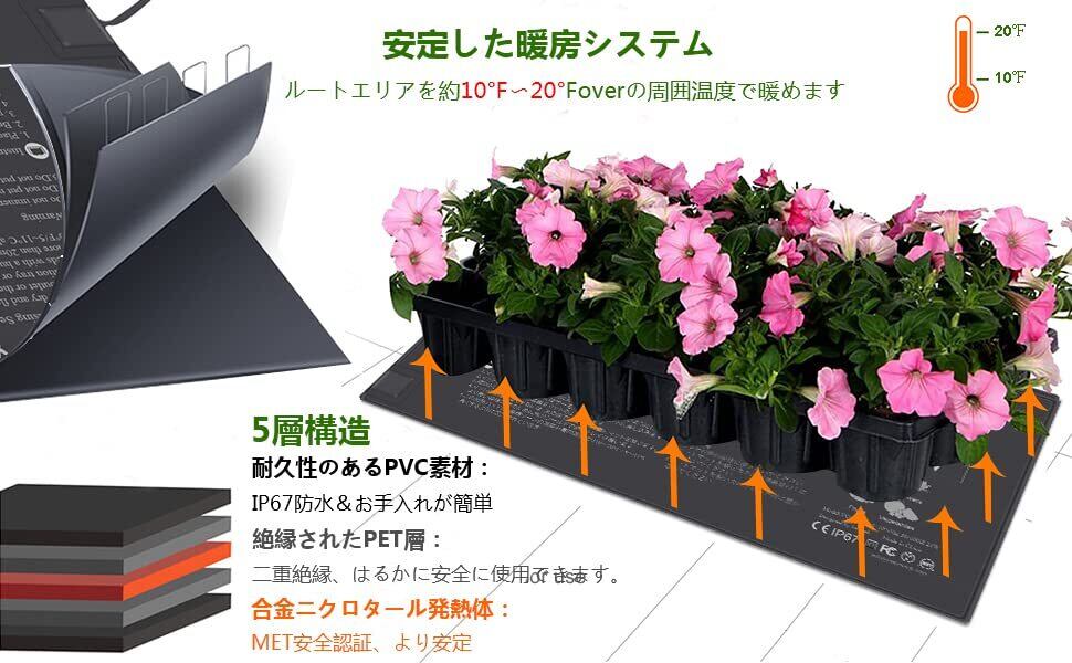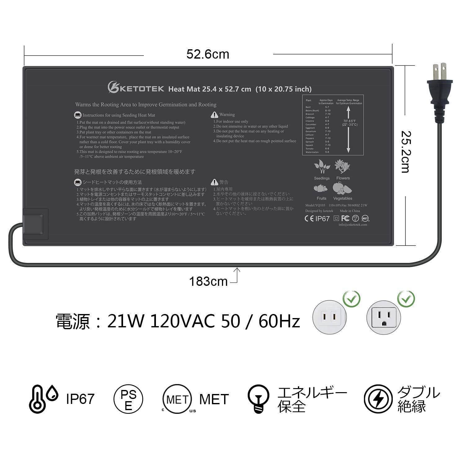 【防水、耐久性、お手入れ簡単】ヒートマットの素材はPVC、IP67防水、サイズは10インチ×20.75インチ(25.2cm×52.6cm)、最大電力:21W、電圧:120VAC 50/60Hz、電源コード。 :1.83m、省エネ、二重断熱。 灌漑などの通常の農作業では水に濡れても問題ありませんが、水中は厳禁です。