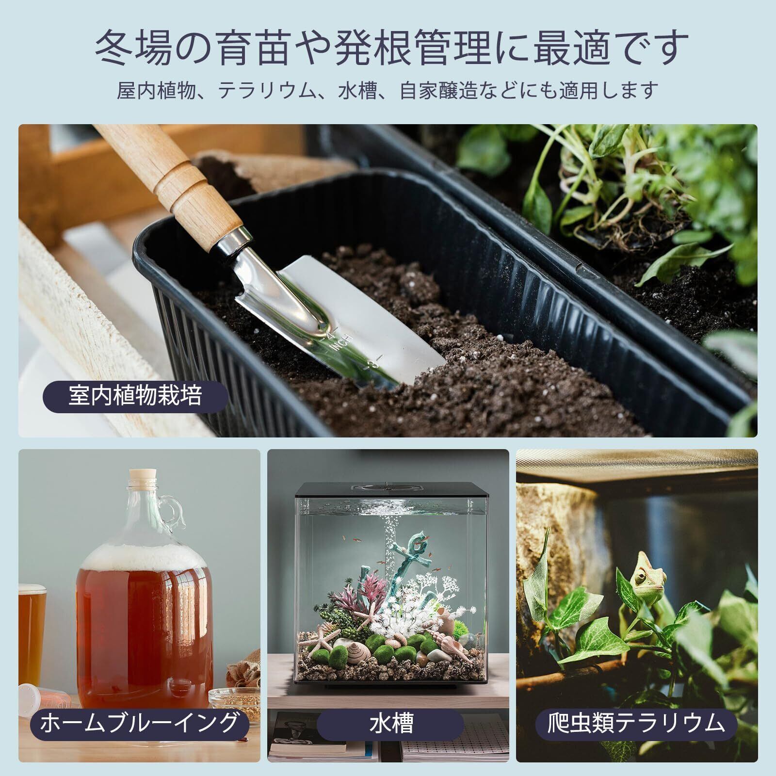 冬場の育苗や発根管理に最適です。屋内植物、テラリウム、水槽、自家醸造などにも適用します