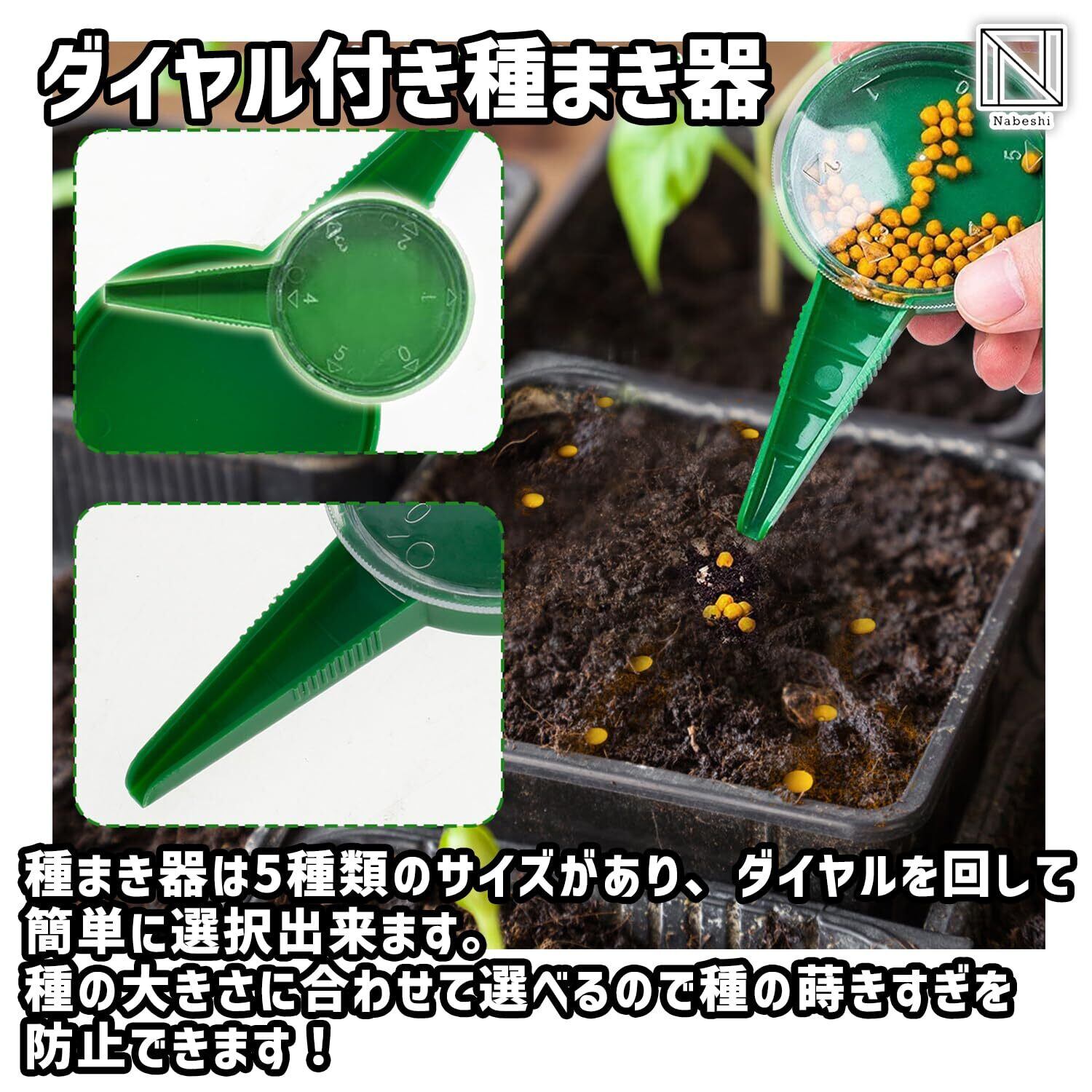 【ダイヤル付き】種まき器は5種類のサイズがあり、ダイヤルを回して簡単に選択出来ます。種の大きさに合わせて選べるので種の蒔きすぎを防止できます!
