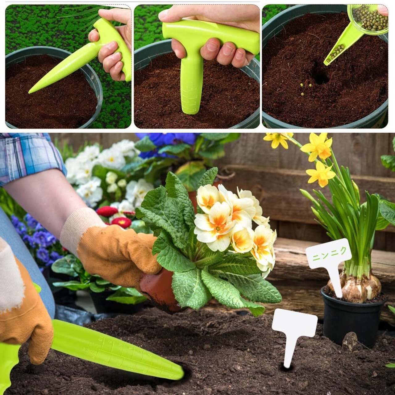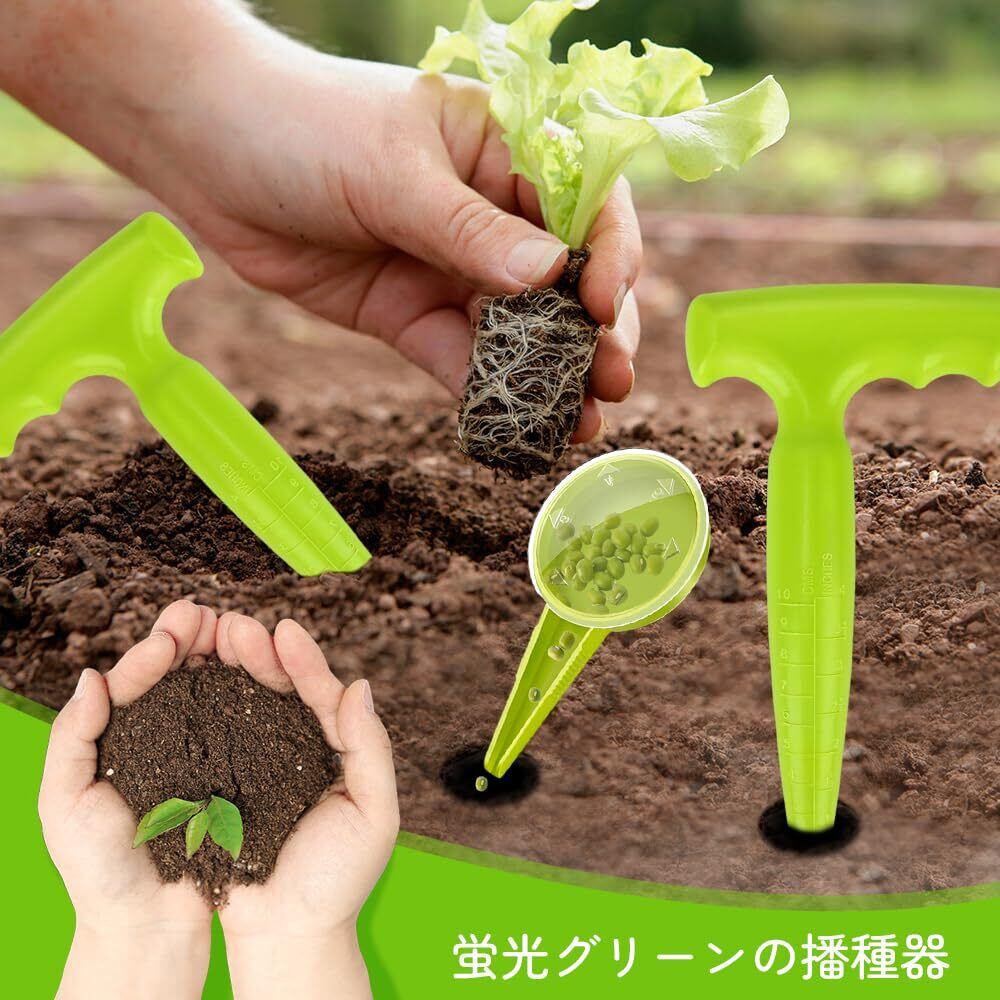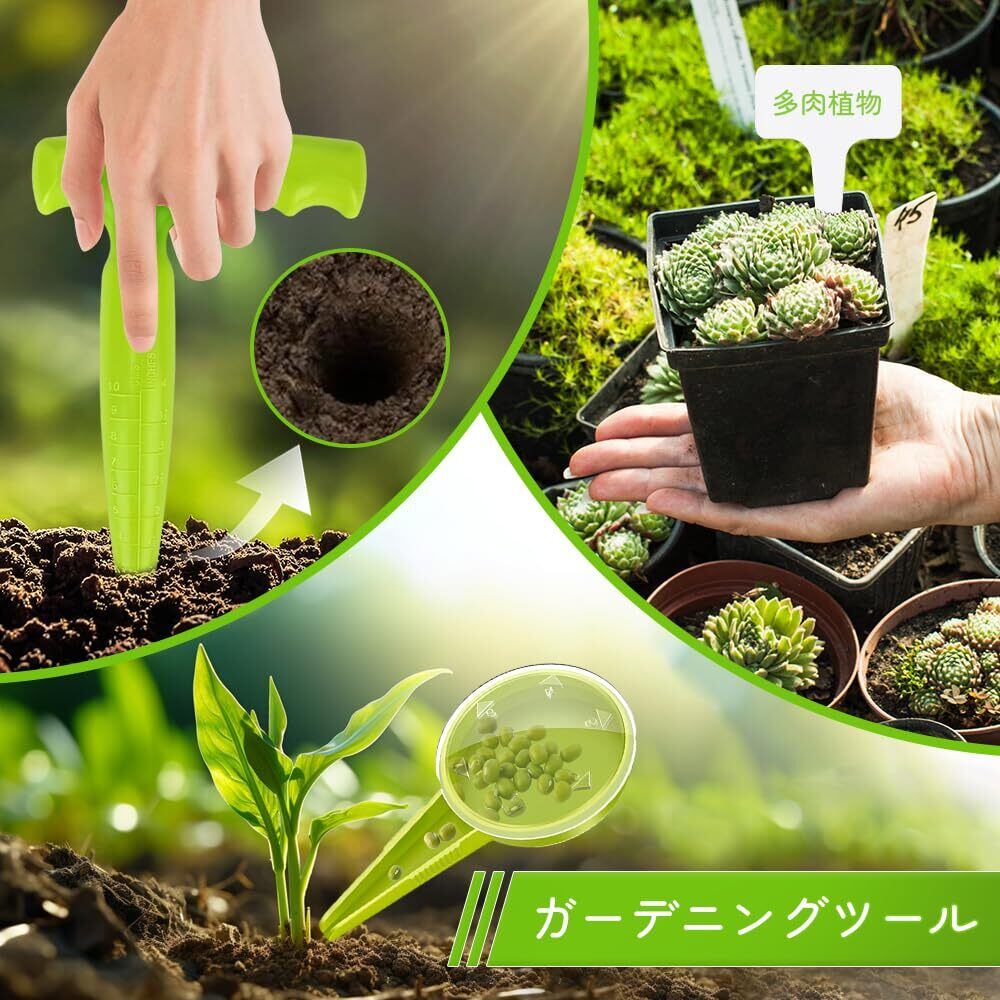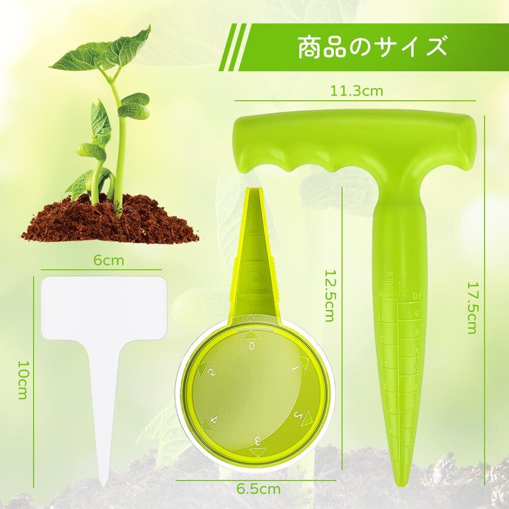【ガーデニングツールセット】:このセットには、播種器や穴あけ器など、実用的なガーデニングツールが含まれており、ガーデニング愛好家の多様なニーズを満たし、使いやすさが特徴です。