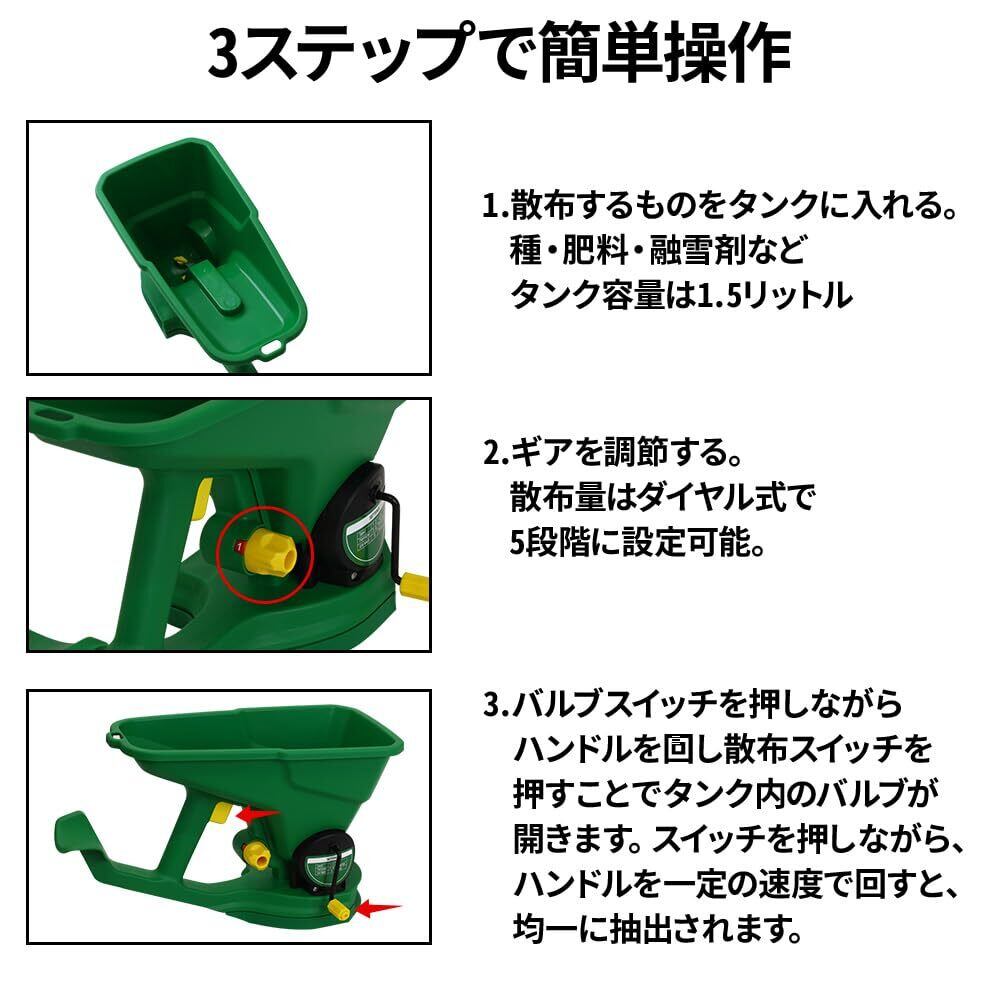 【簡単操作3ステップ】 1.散布するものをタンクに入れる 種・肥料・融雪剤などタンク容量は1.5リットル 2.ギアを調節する 散布量はダイヤル式で5段階に設定可能。 3.バルブスイッチを押しながらハンドルを回す スイッチを押すことでタンク内のバルブが開きます。 スイッチを押しながら、ハンドルを一定の速度で回すと、均一に抽出されます。