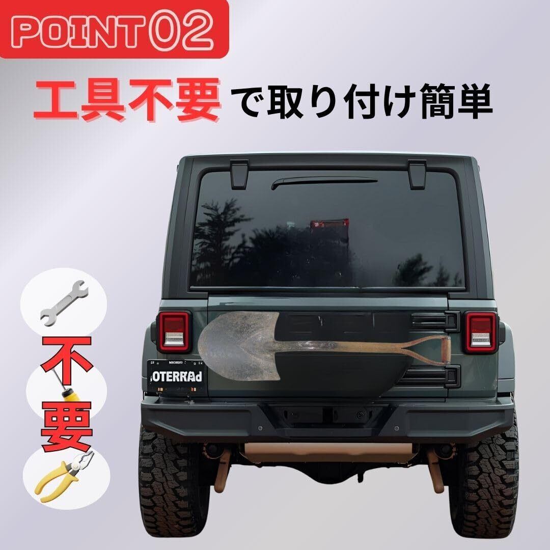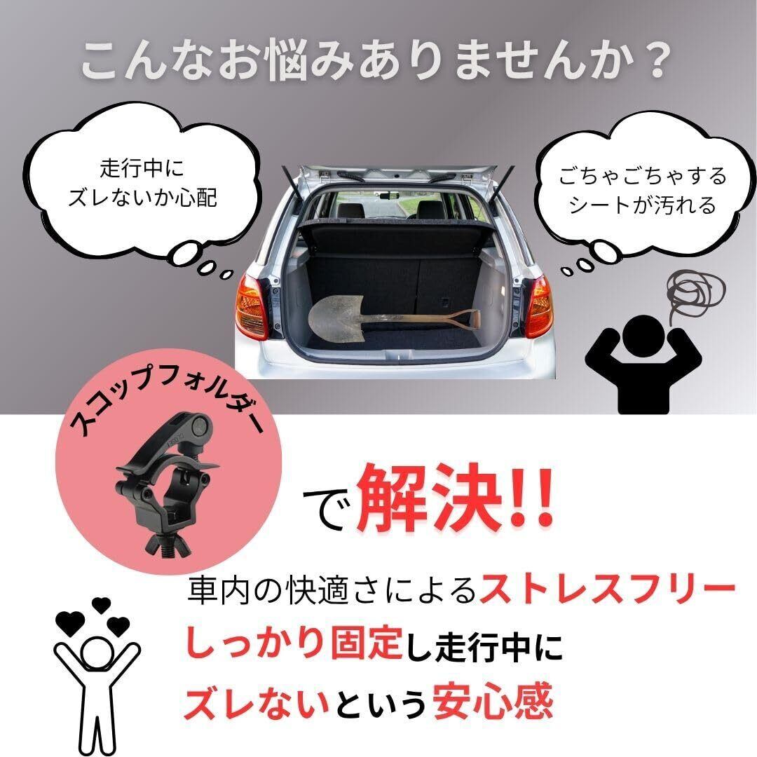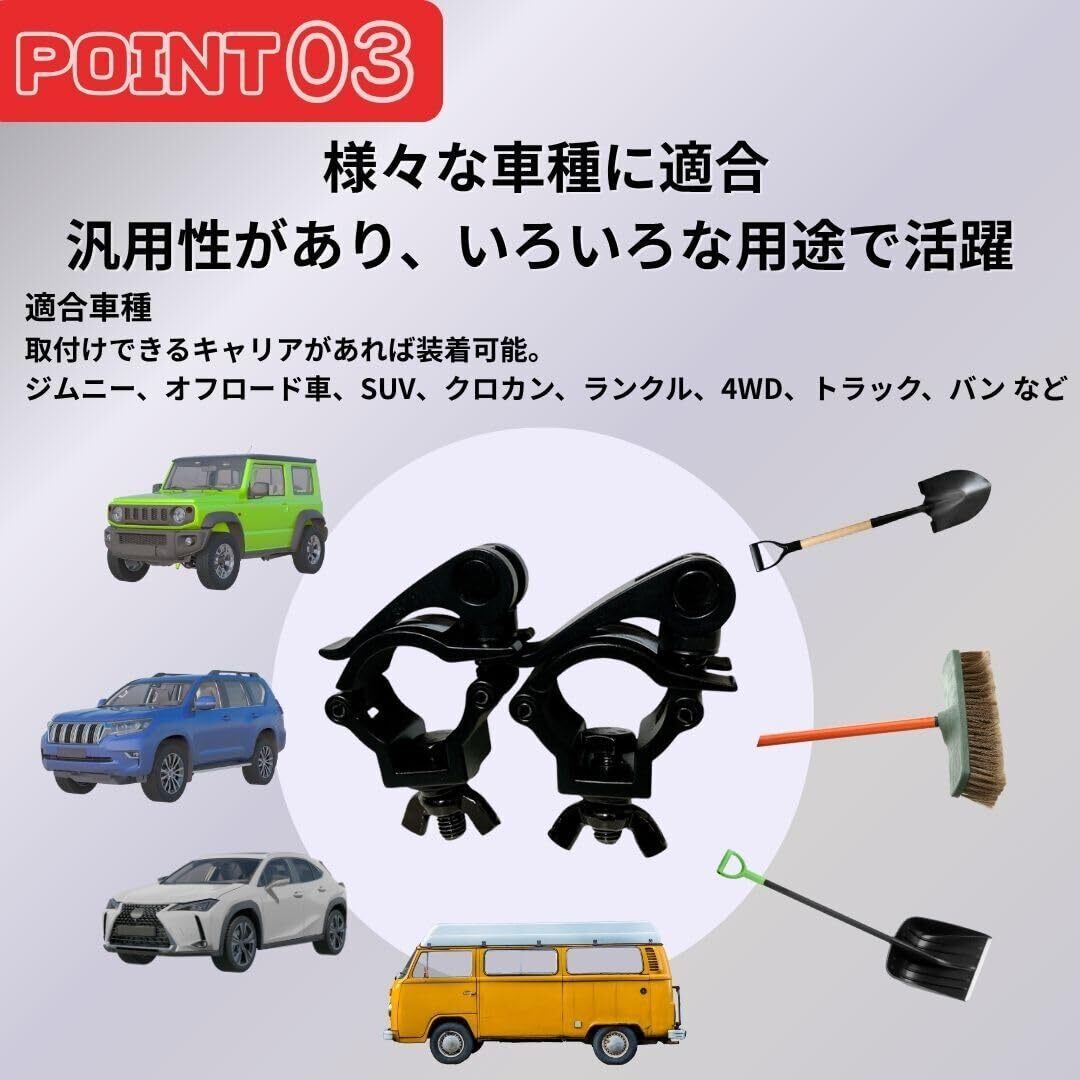 汎用性抜群: 様々な車種に対応するクランプ式スコップホルダー。ジムニー、軽トラック、トラクターなどに最適
