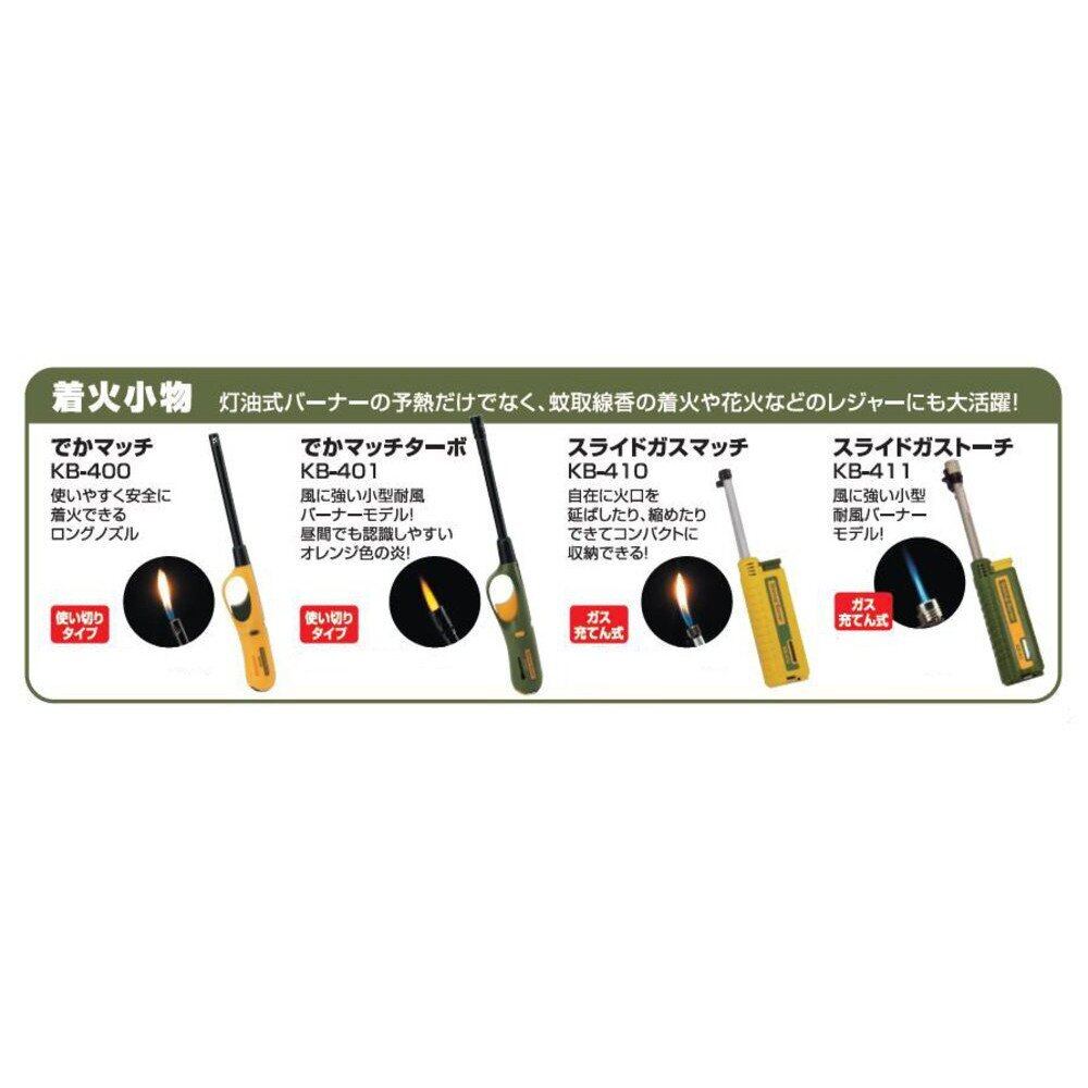 寸法:長さ180x幅50x高さ70mm、重量:260g(本体のみ)、火口径:直径22mm(外径)、炎サイズ:幅50x長さ120mm