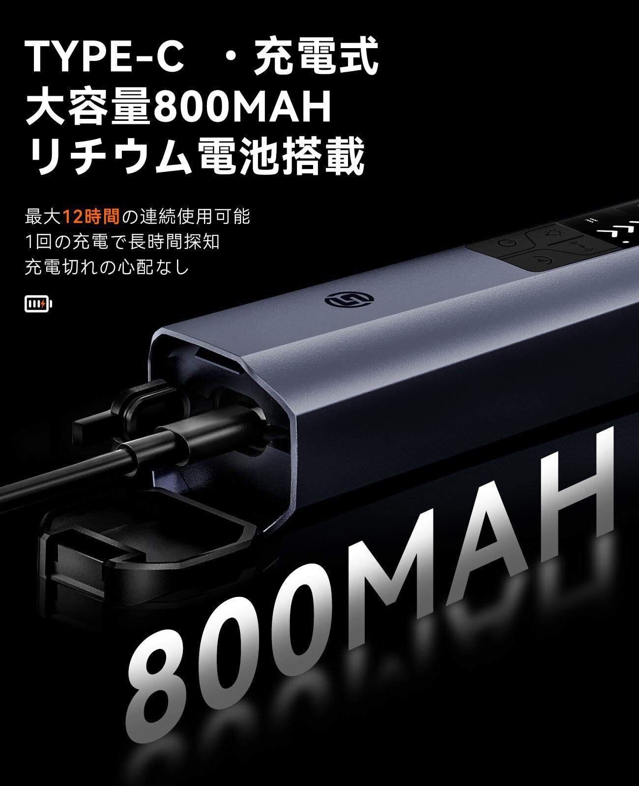 「大容量バッテリーで15時間連続使用可能」 800mAhリチウムバッテリー搭載で、1回の充電で最大15時間稼働。充電しながらの使用も可能で、電池切れの心配なし!