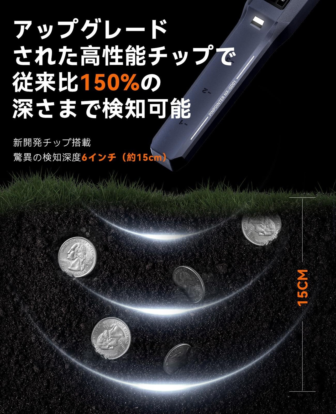 「360°全方位検知&深度15cmまで高精度探知」 360°サイドスキャン技術で、コイン・貴金属・遺物を深度6インチ(約15cm)まで正確に検出。