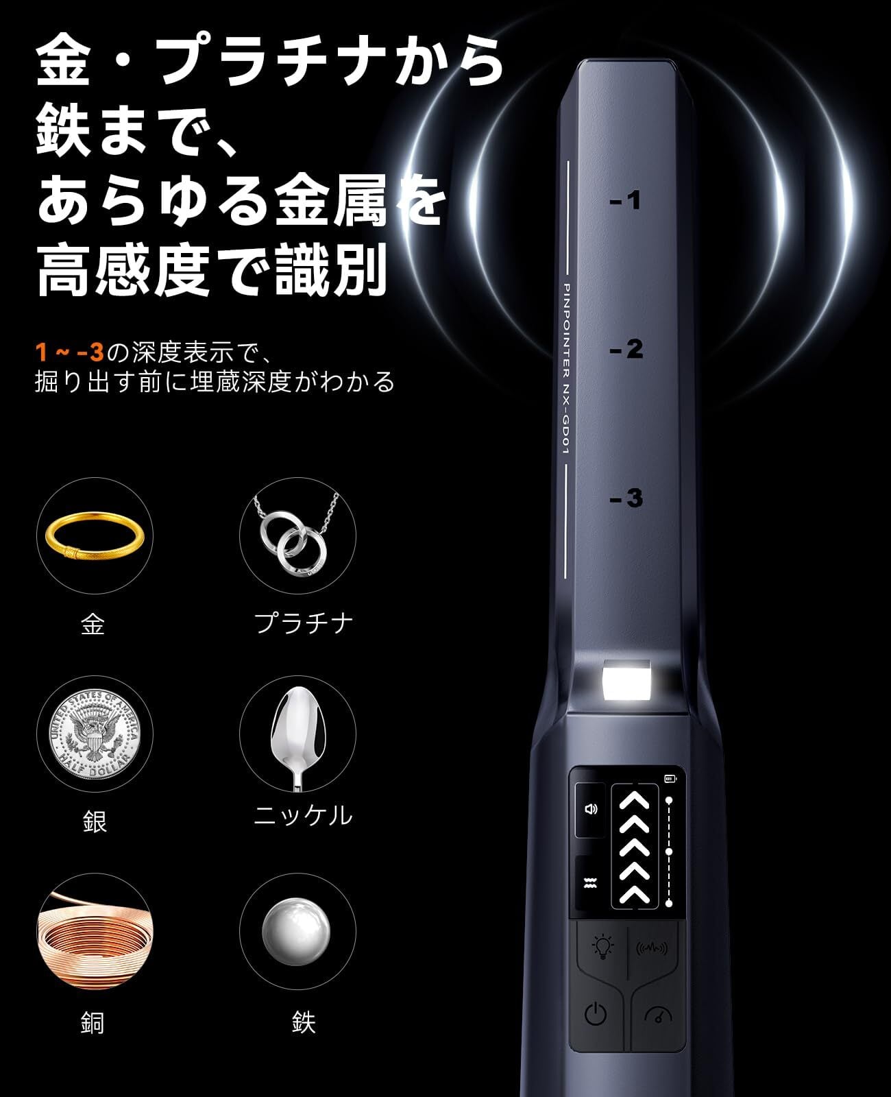 「軽量設計&ピンポイント機能でストレスフリー」 重さ約120gで子供も楽々操作。ピンポインタ付きで掘り起こし場所を正確に特定!