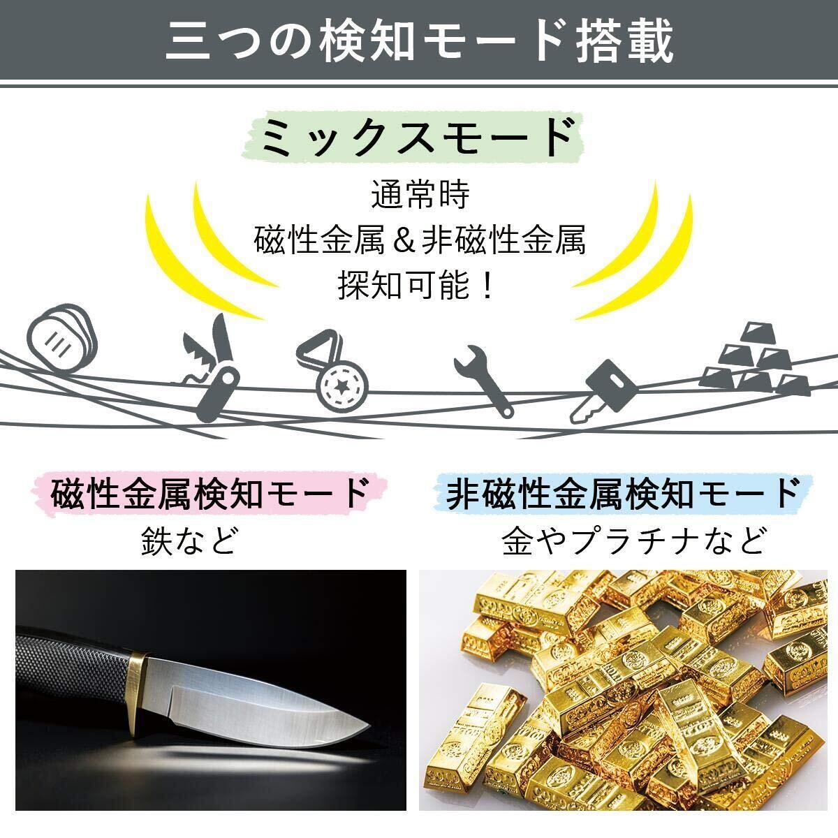 探知モード:3モード ミックスモード、磁性金属検知モード、非磁性金属探知モード(貴金属、非鉄金属など)