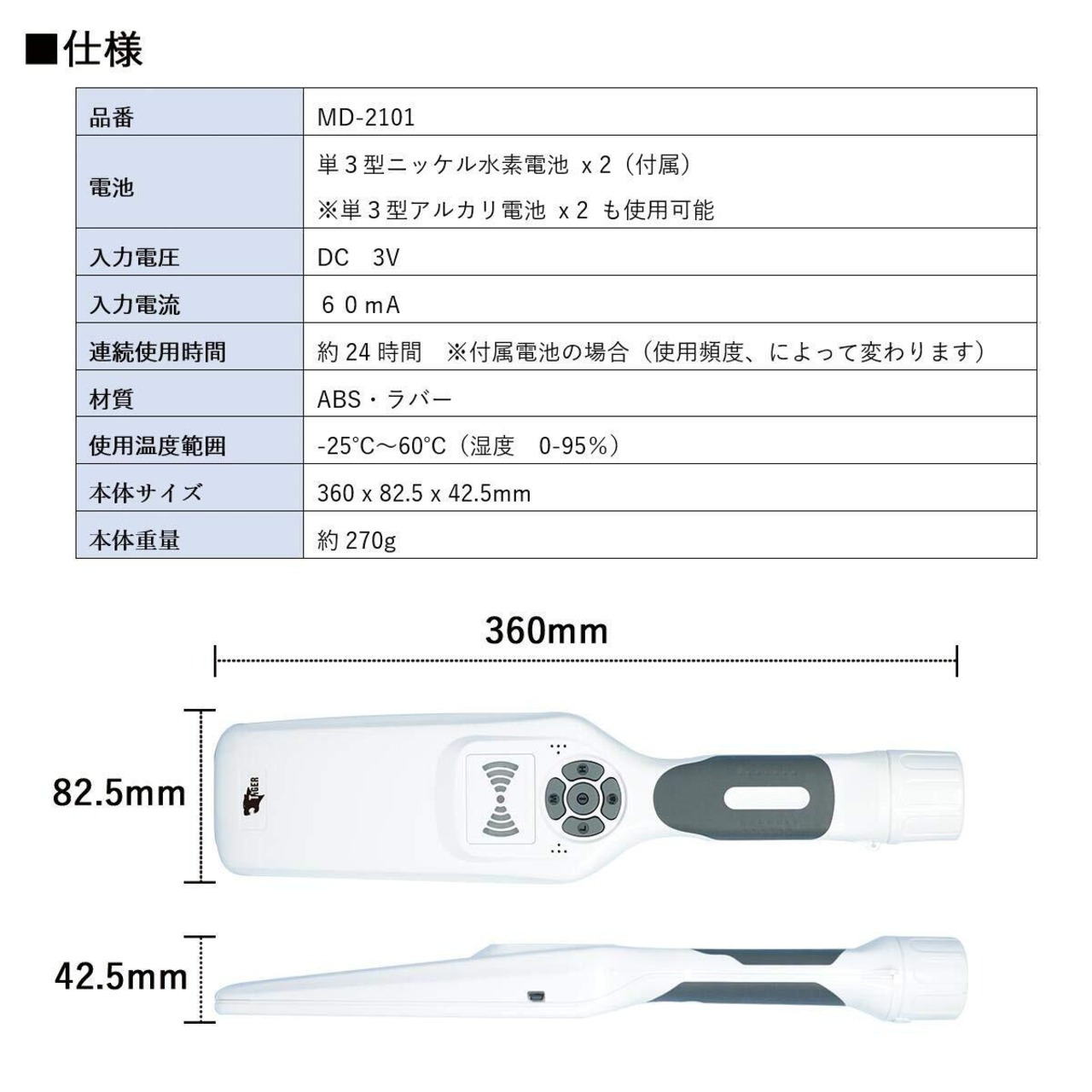 TIGER MD-2101 超高感度 ハンディ 金属探知機 3Way電源 USB充電 単3電池
