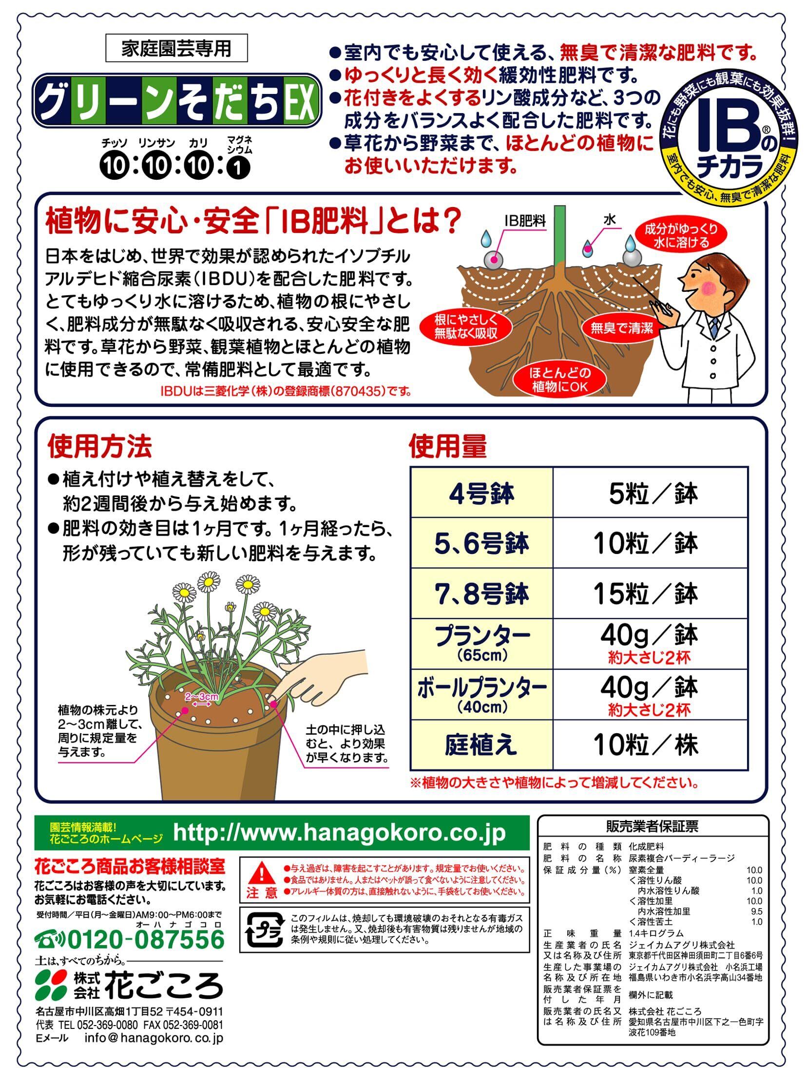 【特別価格】花ごころ IBのチカラ グリーンそだち 室内でも安心、無臭で清潔な肥料 EX 1.4kg