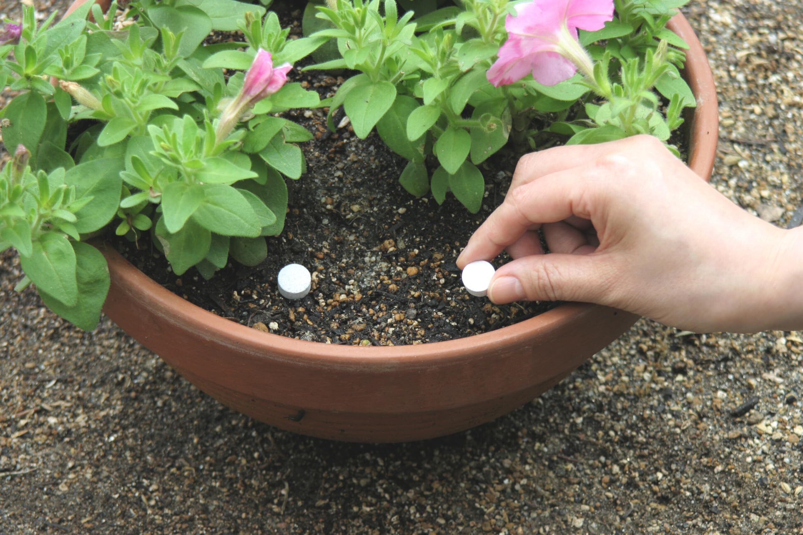 土の上に振りかけてください。小さな鉢には2粒、中サイズの鉢には3粒、大きな鉢には4粒使います。